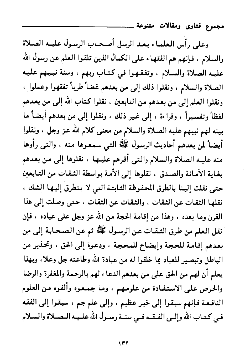 وعلى رأس العلماء بعد الرسل أصحاب الرسول عليه الصلاة والسلام، فإنهم هم الفقهاء على الكمال الذين تلقوا العلم عن رسول الله عليه الصلاة والسلام، وتفقهوا في كتاب ربهم، وسنة نبيهم عليه الصلاه والسلام، ونقلوا ذلك إلى من بعدهم غضا طريا تفقهوا وعملوا، ونقلوا العلم إلى من بعدهم من التابعين، نقلوا كتاب الله إلى من بعدهم لفظا وتفسيرا، وقراءة، إلى غير ذلك، ونقلوا إلى من بعدهم أيضا ما بينه لهم نبيهم عليه الصلاة والسلام من معنى كلام الله عز وجل، ونقلوا أيضا لمن بعدهم أحاديث الرسول صلى الله عليه وسلم التي سمعوها منه، والتي رأوها منه عليه الصلاة والسلام والتي أقرهم عليها، نقلوها إلى من بعدهم بغاية الأمانة والصدق، نقلوها إلى الأمة بواسطة الثقات من التابعين حتى نقلت إلينا بالطرق المحفوظة الثابتة التي لا يتطرق إليها الشك، نقلها الثقات عن الثقات، والثقات عن الثقات، حتى وصلت إلى هذا القرن وما بعده، وهذا من إقامة الحجة من الله عز وجل على عباده، فإن نقل العلم من طرق الثقات عن الرسول صلى الله عليه وسلم ثم عن الصحابة إلى من بعدهم إقامة للحجة وإيضاح للمحجة، ودعوة إلى الحق، وتحذير من الباطل وتبصير للعباد بما خلقوا له من عبادة الله وطاعته جل وعلا، وبهذا يعلم أن لهم من الحق على من بعدهم الدعاء لهم بالرحمة والمغفرة والرضا والحرص على الاستفادة من علومهم، وما جمعوه وألفوه من العلوم النافعة فإنهم سبقوا إلى خير عظيم، وإلى علم جم، سبقوا إلى الفقه في كتاب الله وإلى الفقه في سنة رسول الله عليه الصلاة والسلام