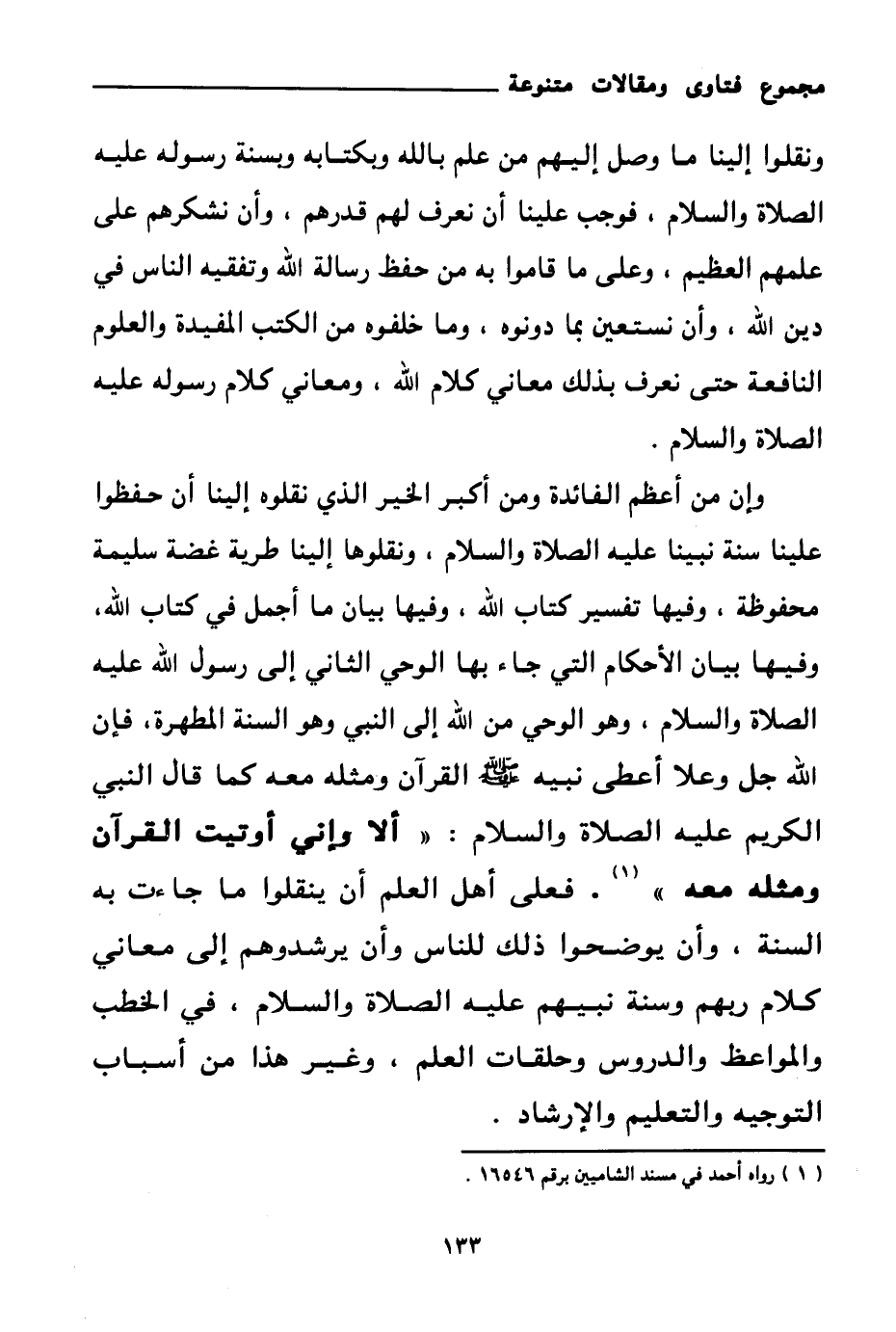 وإن من أعظم الفائدة ومن أكبر الخير الذي نقلوه إلينا أن حفظوا علينا سنة نبينا عليه الصلاة والسلام، ونقلوها إلينا طرية غضة سليمة محفوظة، وفيها تفسير كتاب الله، وفيها بيان ما أجمل في كتاب الله، وفيها بيان الأحكام التي جاء بها الوحي الثاني إلى رسول الله عليه الصلاة والسلام، وهو الوحي من الله إلى النبي وهو السنة المطهرة، فإن الله جل وعلا أعطى نبيه صلى الله عليه وسلم القرآن ومثله معه كما قال النبي الكريم عليه الصلاة والسلام: «ألا وإني أوتيت القرآن ومثله معه (¬1) » .