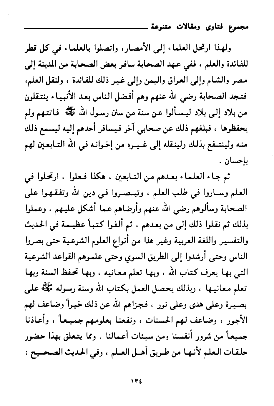 ثم جاء العلماء بعدهم من التابعين، هكذا فعلوا، ارتحلوا في العلم وساروا في طلب العلم، وتبصروا في دين الله وتفقهوا على الصحابة وسألوهم رضي الله عنهم وأرضاهم عما أشكل عليهم، وعملوا بذلك ثم نقلوا ذلك إلى من بعدهم، ثم ألفوا كتبا عظيمة في الحديث والتفسير واللغة العربية وغير هذا من أنواع العلوم الشرعية حتى بصروا الناس وحتى أرشدوا إلى الطريق السوي وحتى علموهم القواعد الشرعية التي بها يعرف كتاب الله، وبها تعلم معانيه، وبها تحفظ السنة وبها تعلم معانيها، وبذلك يحصل العمل بكتاب الله وسنة رسوله صلى الله عليه وسلم على بصيرة وعلى هدى وعلى نور، فجزاهم الله عن ذلك خيرا وضاعف لهم الأجور، وضاعف لهم الحسنات، ونفعنا بعلومهم جميعا، وأعاذنا جميعا من شرور أنفسنا ومن سيئات أعمالنا ومما يتعلق بهذا حضور حلقات العلم لأنها من طريق أهل العلم، وفي الحديث الصحيح: