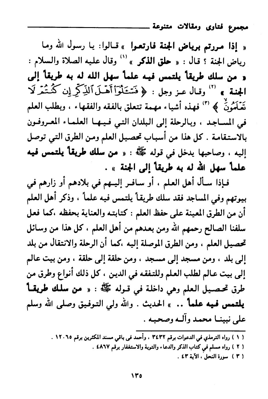 «إذا مررتم برياض الجنة فارتعوا، قالوا: يا رسول الله وما رياض الجنة؟ قال: حلق الذكر (¬1) » وقال عليه الصلاة والسلام: «من سلك طريقا يلتمس فيه علما سهل الله له طريقا إلى الجنة (¬2) » وقال عز وجل: {فَاسْأَلُوا أَهْلَ الذِّكْرِ إِنْ كُنْتُمْ لَا تَعْلَمُونَ} (¬3) فهذه أشياء مهمة تتعلق بالفقه والفقهاء، وبطلب العلم في المساجد، وبالرحلة إلى البلدان التي فيها العلماء المعروفون بالاستقامة كل هذا من أسباب تحصيل العلم ومن الطرق التي توصل إليه، وصاحبها يدخل في قوله صلى الله عليه وسلم: «من سلك طريقا يلتمس فيه علما سهل الله له طريقا إلى الجنة (¬4) » .