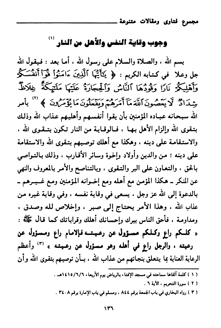 فالوقاية من النار تكون بتقوى الله، والاستقامة على دينه، وهكذا مع أهلك توصيهم بتقوى الله والاستقامة على دينه؛ من والدين وأولاد وإخوة وسائر الأقارب، وذلك بالتواصي بالحق، والتعاون على البر والتقوى، وبالتناصح والأمر بالمعروف والنهي عن المنكر - هكذا المؤمن مع أهله ومع إخوانه المؤمنين ومع غيرهم - بالدعوة إلى الله عز وجل، يسعى في وقاية نفسه، وفي وقاية غيره من عذاب الله، وهذا الأمر يحتاج إلى صبر، وإخلاص لله وصدق، ومداومة، فأحق الناس ببرك وإحسانك أهلك وقراباتك كما قال صلى الله عليه وسلم: «كلكم راع وكلكم مسئول عن رعيته فالإمام راع ومسئول عن رعيته، والرجل راع في أهله وهو مسئول عن رعيته (¬3) » وأعظم الرعاية العناية بما يتعلق بنجاتهم من عذاب الله، بأن توصيهم بتقوى الله وأن