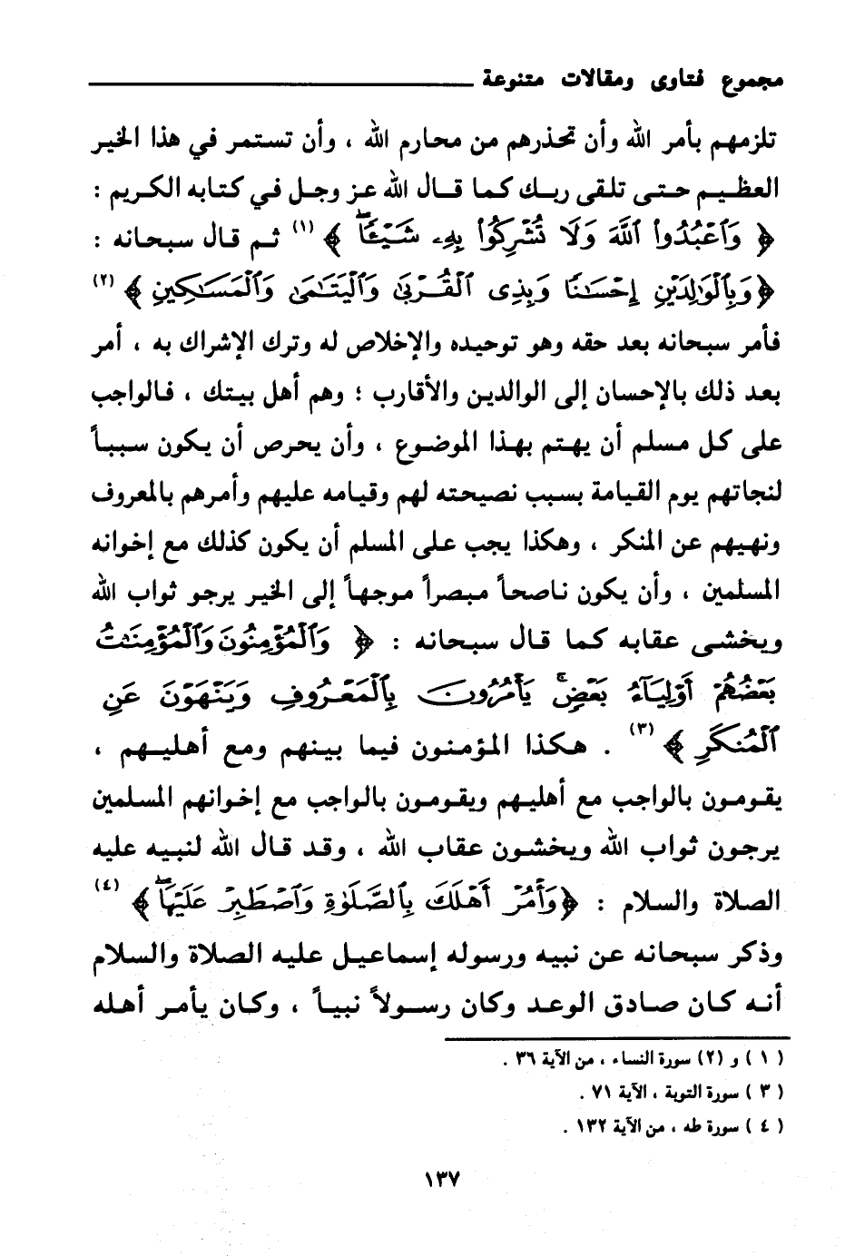 هكذا المؤمنون فيما بينهم ومع أهليهم، يقومون بالواجب مع أهليهم ويقومون بالواجب مع إخوانهم المسلمين يرجون ثواب الله ويخشون عقاب الله، وقد قال الله لنبيه عليه الصلاة والسلام: {وَأْمُرْ أَهْلَكَ بِالصَّلَاةِ وَاصْطَبِرْ عَلَيْهَا} (¬4) وذكر سبحانه عن نبيه ورسوله إسماعيل عليه الصلاة والسلام أنه كان صادق الوعد وكان رسولا نبيا، وكان يأمر أهله