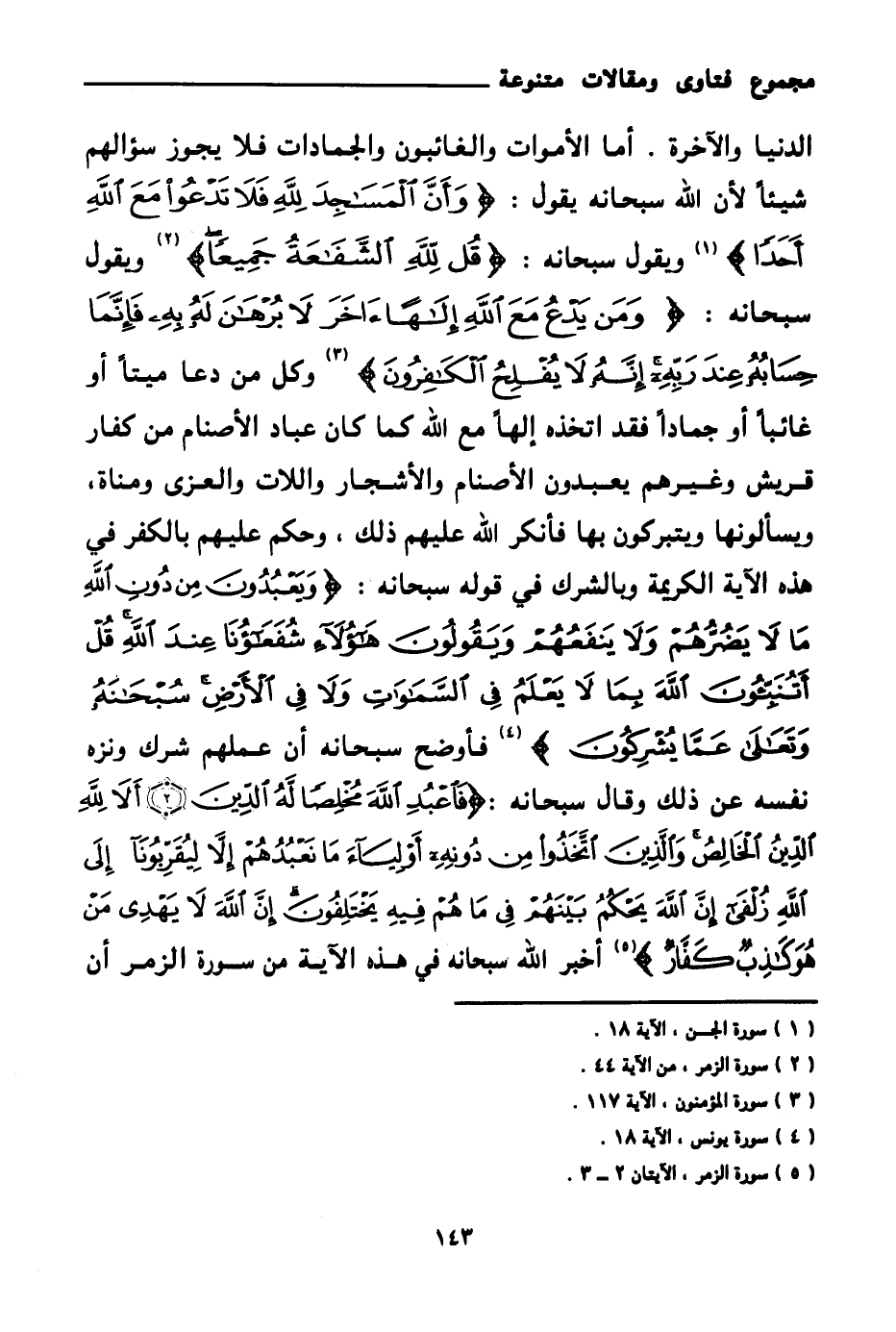 الدنيا والآخرة. أما الأموات والغائبون والجمادات فلا يجوز سؤالهم شيئا لأن الله سبحانه يقول: {وَأَنَّ الْمَسَاجِدَ لِلَّهِ فَلَا تَدْعُوا مَعَ اللَّهِ أَحَدًا} (¬1) ويقول سبحانه: {قُلْ لِلَّهِ الشَّفَاعَةُ جَمِيعًا} (¬2) ويقول سبحانه: {وَمَنْ يَدْعُ مَعَ اللَّهِ إِلَهًا آخَرَ لَا بُرْهَانَ لَهُ بِهِ فَإِنَّمَا حِسَابُهُ عِنْدَ رَبِّهِ إِنَّهُ لَا يُفْلِحُ الْكَافِرُونَ} (¬3) وكل من دعا ميتا أو غائبا أو جمادا فقد اتخذه إلها مع الله كما كان عباد الأصنام من كفار قريش وغيرهم يعبدون الأصنام والأشجار واللات والعزى ومناة، ويسألونها ويتبركون بها فأنكر الله عليهم ذلك، وحكم عليهم بالكفر في هذه الآية الكريمة وبالشرك في قوله سبحانه: {وَيَعْبُدُونَ مِنْ دُونِ اللَّهِ مَا لَا يَضُرُّهُمْ وَلَا يَنْفَعُهُمْ وَيَقُولُونَ هَؤُلَاءِ شُفَعَاؤُنَا عِنْدَ اللَّهِ قُلْ أَتُنَبِّئُونَ اللَّهَ بِمَا لَا يَعْلَمُ فِي السَّمَاوَاتِ وَلَا فِي الْأَرْضِ سُبْحَانَهُ وَتَعَالَى عَمَّا يُشْرِكُونَ} (¬4) فأوضح سبحانه أن عملهم شرك ونزه نفسه عن ذلك وقال سبحانه: {فَاعْبُدِ اللَّهَ مُخْلِصًا لَهُ الدِّينَ} (¬5) {أَلَا لِلَّهِ الدِّينُ الْخَالِصُ وَالَّذِينَ اتَّخَذُوا مِنْ دُونِهِ أَوْلِيَاءَ مَا نَعْبُدُهُمْ إِلَّا لِيُقَرِّبُونَا إِلَى اللَّهِ زُلْفَى إِنَّ اللَّهَ يَحْكُمُ بَيْنَهُمْ فِي مَا هُمْ فِيهِ يَخْتَلِفُونَ إِنَّ اللَّهَ لَا يَهْدِي مَنْ هُوَ كَاذِبٌ كَفَّارٌ} (¬6) أخبر الله سبحانه في هذه الآية من سورة الزمر أن
