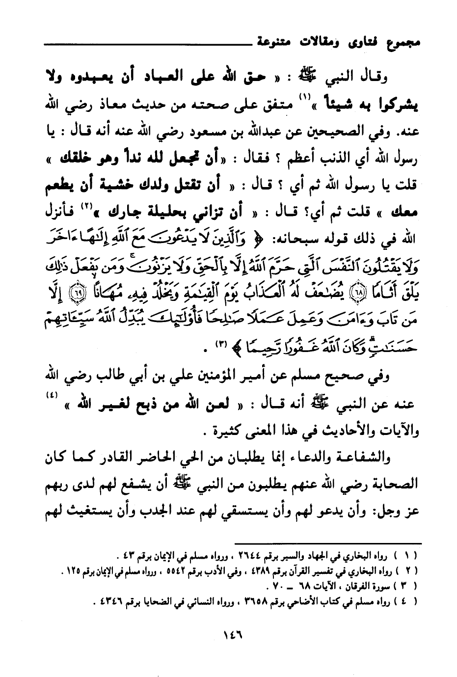 وقال النبي صلى الله عليه وسلم: «حق الله على العباد أن يعبدوه ولا يشركوا به شيئا (¬1) » متفق على صحته من حديث معاذ رضي الله عنه. وفي الصحيحين عن عبد الله بن مسعود رضي الله عنه أنه قال: «يا رسول الله: أي الذنب أعظم؟ فقال: أن تجعل لله ندا وهو خلقك، قلت: يا رسول الله ثم أي؟ قال: أن تقتل ولدك خشية أن يطعم معك، قلت ثم أي؟ قال: أن تزاني بحليلة جارك (¬2) » فأنزل الله في ذلك قوله سبحانه: {وَالَّذِينَ لَا يَدْعُونَ مَعَ اللَّهِ إِلَهًا آخَرَ وَلَا يَقْتُلُونَ النَّفْسَ الَّتِي حَرَّمَ اللَّهُ إِلَّا بِالْحَقِّ وَلَا يَزْنُونَ وَمَنْ يَفْعَلْ ذَلِكَ يَلْقَ أَثَامًا} (¬3) {يُضَاعَفْ لَهُ الْعَذَابُ يَوْمَ الْقِيَامَةِ وَيَخْلُدْ فِيهِ مُهَانًا} (¬4) {إِلَّا مَنْ تَابَ وَآمَنَ وَعَمِلَ عَمَلًا صَالِحًا فَأُولَئِكَ يُبَدِّلُ اللَّهُ سَيِّئَاتِهِمْ حَسَنَاتٍ وَكَانَ اللَّهُ غَفُورًا رَحِيمًا} (¬5)