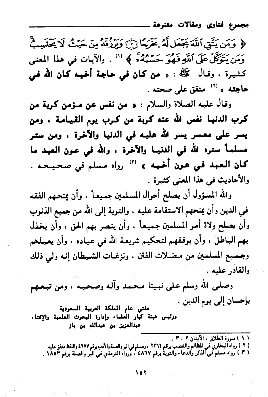 والله المسئول أن يصلح أحوال المسلمين جميعا، وأن يمنحهم الفقه في الدين، وأن يمنحهم الاستقامة عليه، والتوبة إلى الله من جميع الذنوب، وأن يصلح ولاة أمر المسلمين جميعا، وأن ينصر بهم الحق، وأن يخذل بهم الباطل، وأن يوفقهم لتحكيم شريعة الله في عباده، وأن يعيذهم وجميع المسلمين من مضلات الفتن، ونزغات الشيطان إنه ولي ذلك والقادر عليه.