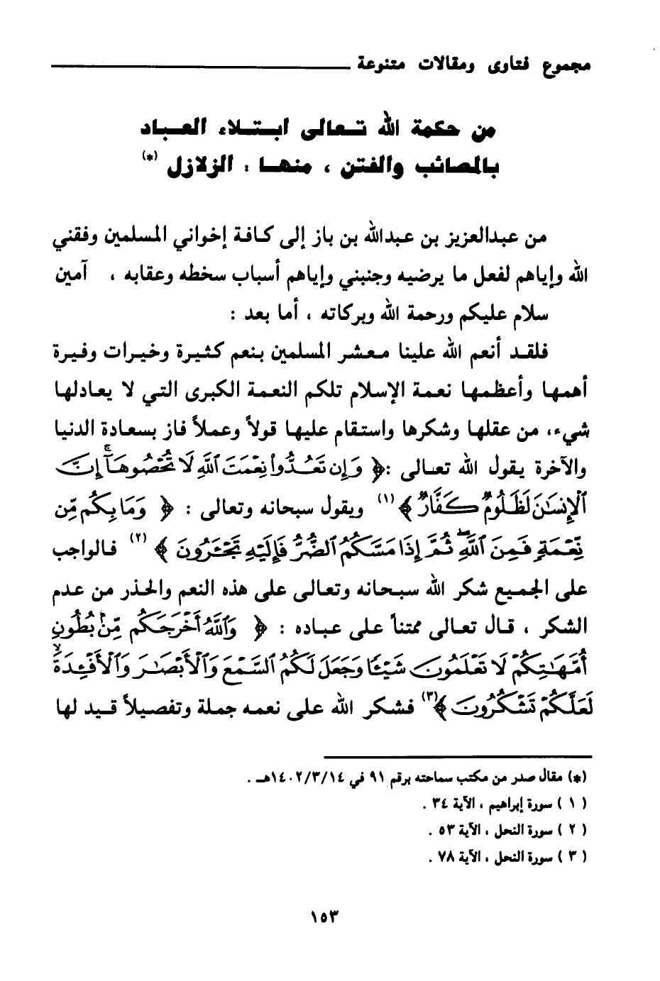 من عبد العزيز بن عبد الله بن باز إلى كافة إخواني المسلمين وفقني الله وإياهم لفعل ما يرضيه وجنبني وإياهم أسباب سخطه وعقابه، آمين.