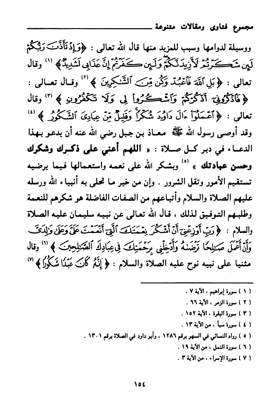 ووسيلة لدوامها وسبب للمزيد منها قال الله تعالى: {وَإِذْ تَأَذَّنَ رَبُّكُمْ لَئِنْ شَكَرْتُمْ لَأَزِيدَنَّكُمْ وَلَئِنْ كَفَرْتُمْ إِنَّ عَذَابِي لَشَدِيدٌ} (¬1) وقال تعالى: {بَلِ اللَّهَ فَاعْبُدْ وَكُنْ مِنَ الشَّاكِرِينَ} (¬2) وقال تعالى: {فَاذْكُرُونِي أَذْكُرْكُمْ وَاشْكُرُوا لِي وَلَا تَكْفُرُونِ} (¬3) وقال تعالى: {اعْمَلُوا آلَ دَاوُدَ شُكْرًا وَقَلِيلٌ مِنْ عِبَادِيَ الشَّكُورُ} (¬4) وقد «أوصى رسول الله صلى الله عليه وسلم معاذ بن جبل رضي الله عنه أن يدعو بهذا الدعاء في دبر كل صلاة: اللهم أعني على ذكرك وشكرك وحسن عبادتك (¬5) » وبشكر الله على نعمه واستعمالها فيما يرضيه تستقيم الأمور وتقل الشرور.
