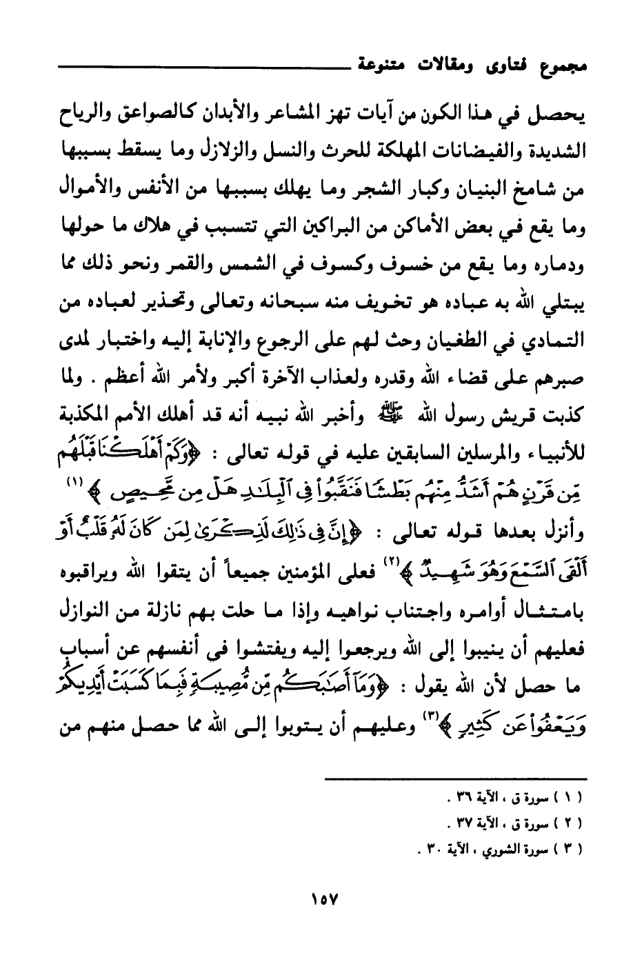ولما كذبت قريش رسول الله صلى الله عليه وسلم وأخبر الله نبيه أنه قد أهلك الأمم المكذبة للأنبياء والمرسلين السابقين عليه في قوله تعالى: {وَكَمْ أَهْلَكْنَا قَبْلَهُمْ مِنْ قَرْنٍ هُمْ أَشَدُّ مِنْهُمْ بَطْشًا فَنَقَّبُوا فِي الْبِلَادِ هَلْ مِنْ مَحِيصٍ} (¬1) وأنزل بعدها قوله تعالى: {إِنَّ فِي ذَلِكَ لَذِكْرَى لِمَنْ كَانَ لَهُ قَلْبٌ أَوْ أَلْقَى السَّمْعَ وَهُوَ شَهِيدٌ} (¬2) فعلى المؤمنين جميعا أن يتقوا الله ويراقبوه بامتثال أوامره واجتناب نواهيه وإذا ما حلت بهم نازلة من النوازل فعليهم أن ينيبوا إلى الله ويرجعوا إليه ويفتشوا في أنفسهم عن أسباب ما حصل لأن الله يقول: {وَمَا أَصَابَكُمْ مِنْ مُصِيبَةٍ فَبِمَا كَسَبَتْ أَيْدِيكُمْ وَيَعْفُو عَنْ كَثِيرٍ} (¬3)