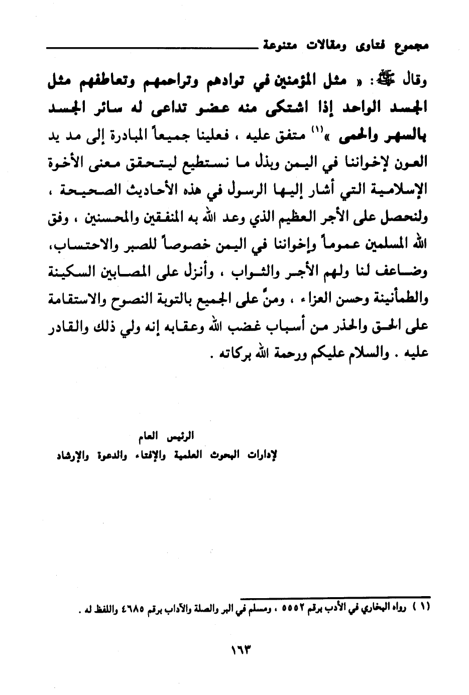 وقال صلى الله عليه وسلم: «مثل المؤمنين في توادهم وتراحمهم وتعاطفهم مثل الجسد الواحد إذا اشتكى منه عضو تداعى له سائر الجسد بالسهر والحمى (¬1) » متفق عليه، فعلينا جميعا المبادرة إلى مد يد العون لإخواننا في اليمن وبذل ما نستطيع ليتحقق معنى الأخوة الإسلامية التي أشار إليها الرسول في هذه الأحاديث الصحيحة، ولنحصل على الأجر العظيم الذي وعد الله به المنفقين والمحسنين، وفق الله المسلمين عموما وإخواننا في اليمن خصوصا للصبر والاحتساب، وضاعف لنا ولهم الأجر والثواب، وأنزل على المصابين السكينة والطمأنينة وحسن العزاء، ومن على الجميع بالتوبة النصوح والاستقامة على الحق والحذر من أسباب غضب الله وعقابه إنه ولي ذلك والقادر عليه.