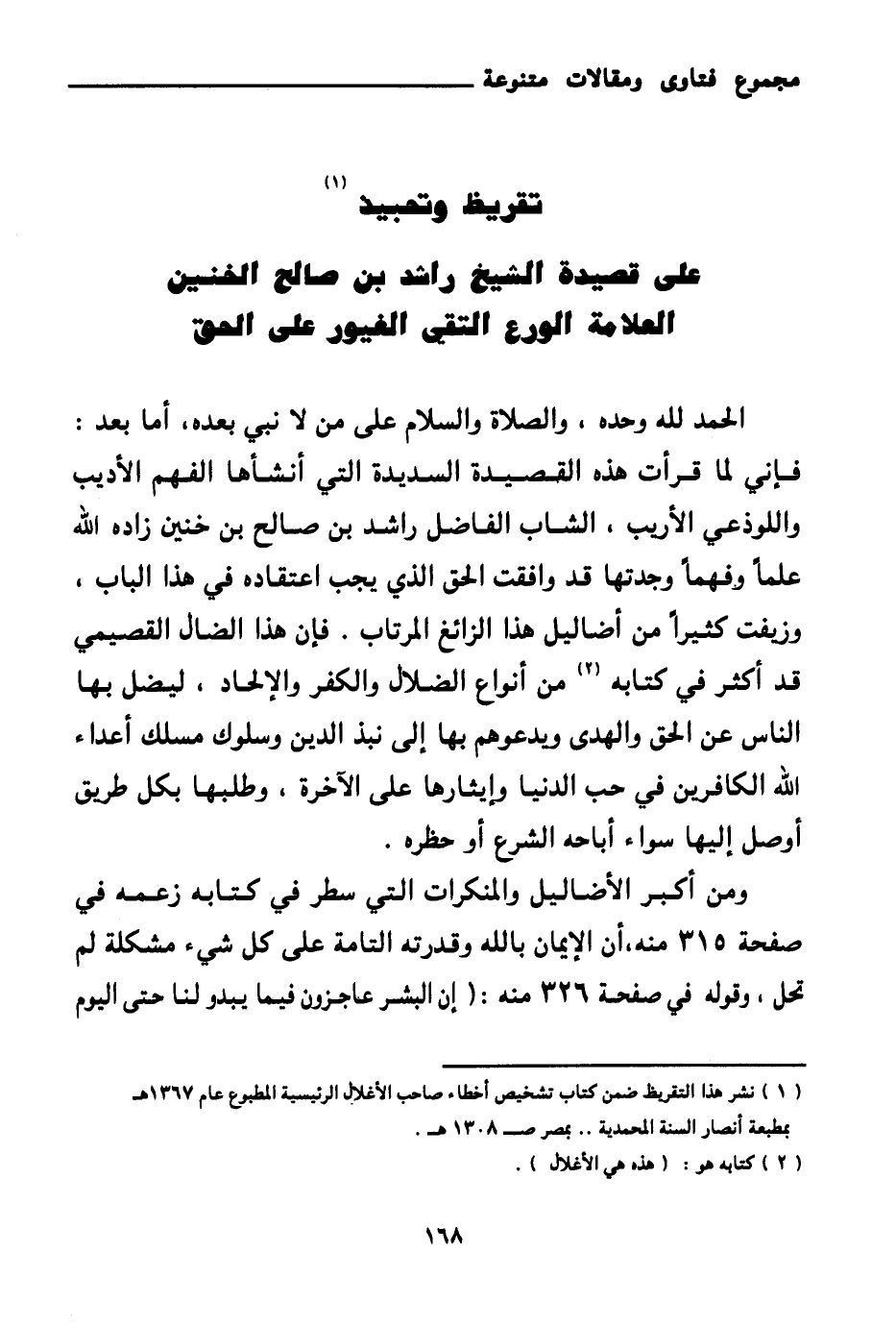 فإني لما قرأت هذه القصيدة السديدة التي أنشأها الفهم الأديب واللوذعي الأريب، الشاب الفاضل راشد بن صالح بن خنين زاده الله علما وفهما وجدتها قد وافقت الحق الذي يجب اعتقاده في هذا الباب، وزيفت كثيرا من أضاليل هذا الزائغ المرتاب. فإن هذا الضال القصيمي قد أكثر في كتابه (¬1) من أنواع الضلال والكفر والإلحاد، ليضل بها الناس عن الحق والهدى ويدعوهم بها إلى نبذ الدين وسلوك مسلك أعداء الله الكافرين في حب الدنيا وإيثارها على الآخرة، وطلبها بكل طريق أوصل إليها سواء أباحه الشرع أو حظره.