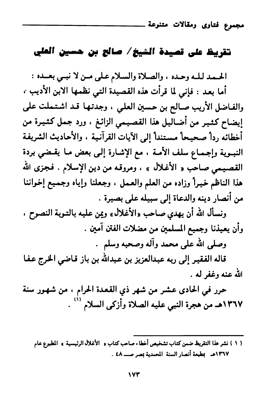 أما بعد: فإني لما قرأت هذه القصيدة التي نظمها الابن الأديب، والفاضل الأريب صالح بن حسين العلي، وجدتها قد اشتملت على إيضاح كثير من أضاليل هذا القصيمي الزائغ، ورد جمل كثيرة من أخطائه ردا صحيحا مستندا إلى الآيات القرآنية، والأحاديث الشريفة النبوية وإجماع سلف الأمة، مع الإشارة إلى بعض ما يقضي بردة القصيمي صاحب " الأغلال "، ومروقه من دين الإسلام. فجزى الله هذا الناظم خيرا وزاده من العلم والعمل، وجعلنا وإياه وجميع إخواننا من أنصار دينه والدعاة إلى سبيله على بصيرة.