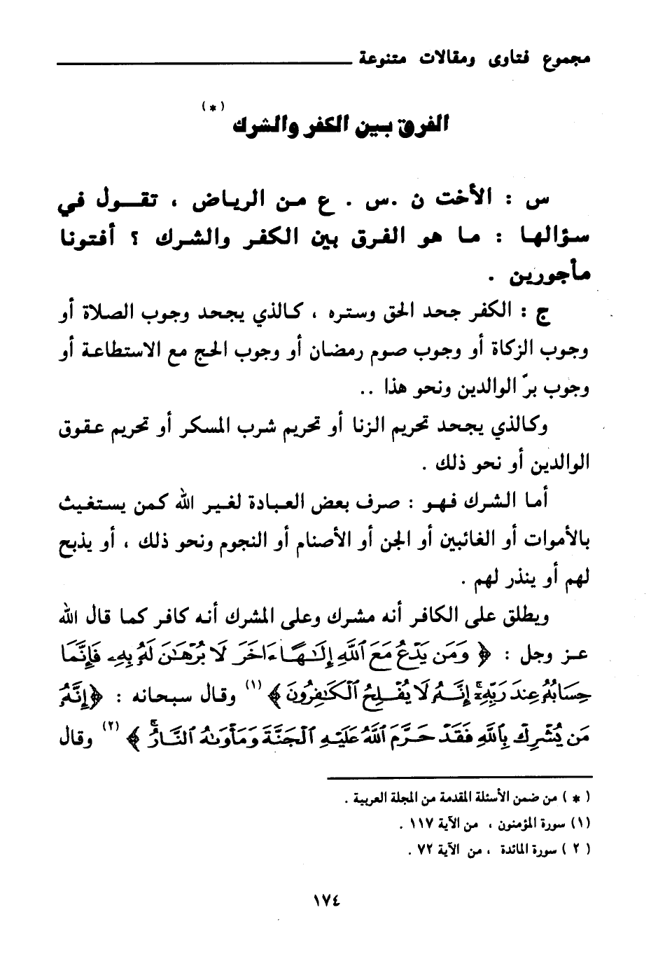 س: الأخت ن. س. ع من الرياض، تقول في سؤالها: ما هو الفرق بين الكفر والشرك أفتونا مأجورين. .
