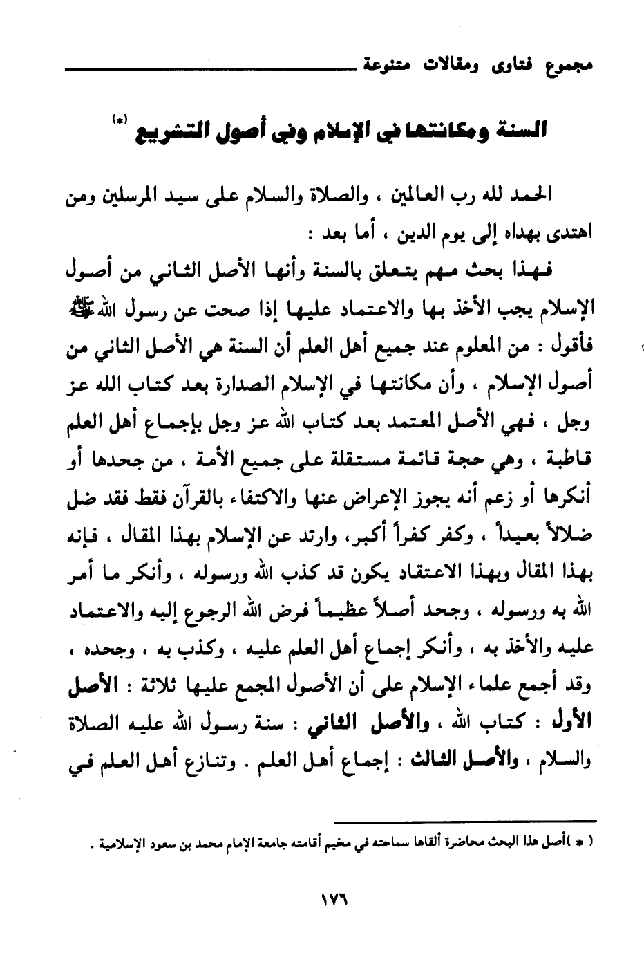 فهذا بحث مهم يتعلق بالسنة وأنها الأصل الثاني من أصول الإسلام يجب الأخذ بها والاعتماد عليها إذا صحت عن رسول الله صلى الله عليه وسلم فأقول: من المعلوم عند جميع أهل العلم أن السنة هي الأصل الثاني من أصول الإسلام، وأن مكانتها في الإسلام الصدارة بعد كتاب الله عز وجل، فهي الأصل المعتمد بعد كتاب الله عز وجل بإجماع أهل العلم قاطبة، وهي حجة قائمة مستقلة على جميع الأمة، من جحدها أو أنكرها أو زعم أنه يجوز الإعراض عنها والاكتفاء بالقرآن فقط فقد ضل ضلالا بعيدا، وكفر كفرا أكبر، وارتد عن الإسلام بهذا المقال، فإنه بهذا المقال وبهذا الاعتقاد يكون قد كذب الله ورسوله، وأنكر ما أمر الله به ورسوله، وجحد أصلا عظيما فرض الله الرجوع إليه والاعتماد عليه والأخذ به، وأنكر إجماع أهل العلم عليه، وكذب به، وجحده، وقد أجمع علماء الإسلام على أن الأصول المجمع عليها ثلاثة: الأصل الأول: كتاب الله. والأصل الثاني: سنة رسول الله عليه الصلاة والسلام. والأصل الثالث: إجماع أهل العلم وتنازع أهل العلم في