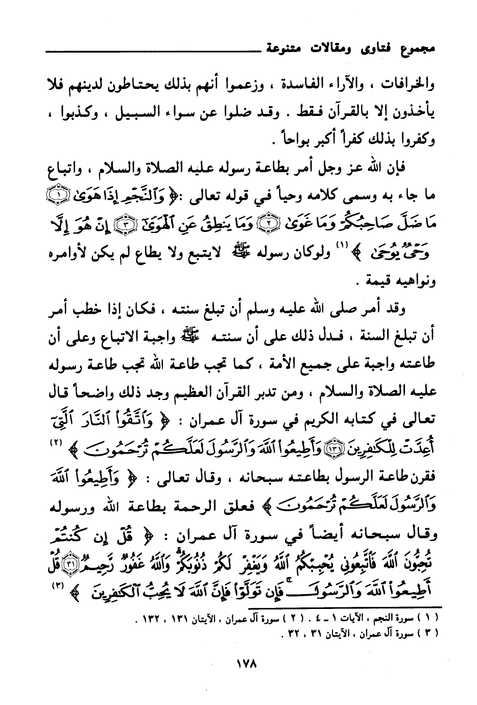 وقد أمر صلى الله عليه وسلم أن تبلغ سنته، فكان إذا خطب أمر أن تبلغ السنة، فدل ذلك على أن سنته صلى الله عليه وسلم واجبة الاتباع وعلى أن طاعته واجبة على جميع الأمة، كما تجب طاعة الله تجب طاعة رسوله عليه الصلاة والسلام، ومن تدبر القرآن العظيم وجد ذلك واضحا قال تعالى في كتابه الكريم في سورة آل عمران: {وَاتَّقُوا النَّارَ الَّتِي أُعِدَّتْ لِلْكَافِرِينَ} (¬5) {وَأَطِيعُوا اللَّهَ وَالرَّسُولَ لَعَلَّكُمْ تُرْحَمُونَ} (¬6) فقرن طاعة الرسول بطاعته سبحانه، وقال تعالى: {وَأَطِيعُوا اللَّهَ وَالرَّسُولَ لَعَلَّكُمْ تُرْحَمُونَ} (¬7) فعلق الرحمة بطاعة الله ورسوله وقال سبحانه أيضا في سورة آل عمران: {قُلْ إِنْ كُنْتُمْ تُحِبُّونَ اللَّهَ فَاتَّبِعُونِي يُحْبِبْكُمُ اللَّهُ وَيَغْفِرْ لَكُمْ ذُنُوبَكُمْ وَاللَّهُ غَفُورٌ رَحِيمٌ} (¬8) {قُلْ أَطِيعُوا اللَّهَ وَالرَّسُولَ فَإِنْ تَوَلَّوْا فَإِنَّ اللَّهَ لَا يُحِبُّ الْكَافِرِينَ} (¬9)