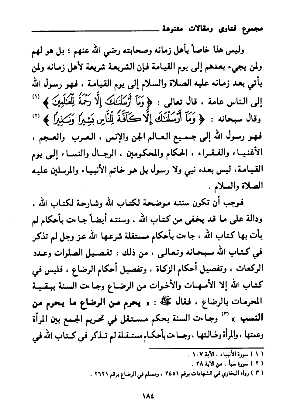 وليس هذا خاصا بأهل زمانه وصحابته رضي الله عنهم بل هو لهم ولمن يجيء بعدهم إلى يوم القيامة فإن الشريعة شريعة لأهل زمانه ولمن يأتي بعد زمانه عليه الصلاة والسلام إلى يوم القيامة، فهو رسول الله إلى الناس عامة، قال تعالى: {وَمَا أَرْسَلْنَاكَ إِلَّا رَحْمَةً لِلْعَالَمِينَ} (¬1) وقال سبحانه: {وَمَا أَرْسَلْنَاكَ إِلَّا كَافَّةً لِلنَّاسِ بَشِيرًا وَنَذِيرًا} (¬2) فهو رسول الله إلى جميع العالم الجن والإنس، العرب والعجم، الأغنياء والفقراء، الحكام والمحكومين، الرجال والنساء إلى يوم القيامة، ليس بعده نبي ولا رسول بل هو خاتم الأنبياء والمرسلين عليه الصلاة والسلام.