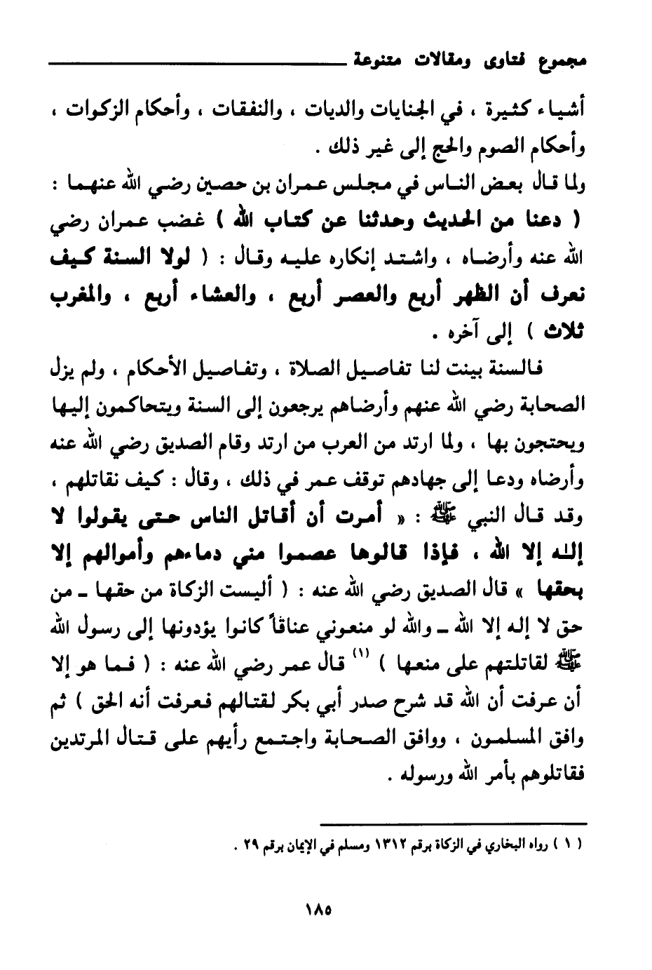 فالسنة بينت لنا تفاصيل الصلاة، وتفاصيل الأحكام، ولم يزل الصحابة رضي الله عنهم وأرضاهم يرجعون إلى السنة ويتحاكمون إليها ويحتجون بها، ولما ارتد من العرب من ارتد وقام الصديق رضي الله عنه وأرضاه ودعا إلى جهادهم توقف عمر في ذلك، وقال: كيف نقاتلهم، وقد قال النبي صلى الله عليه وسلم: «أمرت أن أقاتل الناس حتى يقولوا: لا إله إلا الله، فإذا قالوها عصموا مني دماءهم وأموالهم إلا بحقها (¬1) » قال الصديق رضي الله عنه: «أليست الزكاة من حقها - من حق لا إله إلا الله - والله لو منعوني عناقا كانوا يؤدونها إلى رسول الله صلى الله عليه وسلم لقاتلتهم على منعها (¬2) » قال عمر رضي الله عنه: (فما هو إلا أن عرفت أن الله قد شرح صدر أبي بكر لقتالهم فعرفت أنه الحق) ثم وافق المسلمون، ووافق الصحابة واجتمع رأيهم على قتال المرتدين فقاتلوهم بأمر الله ورسوله.