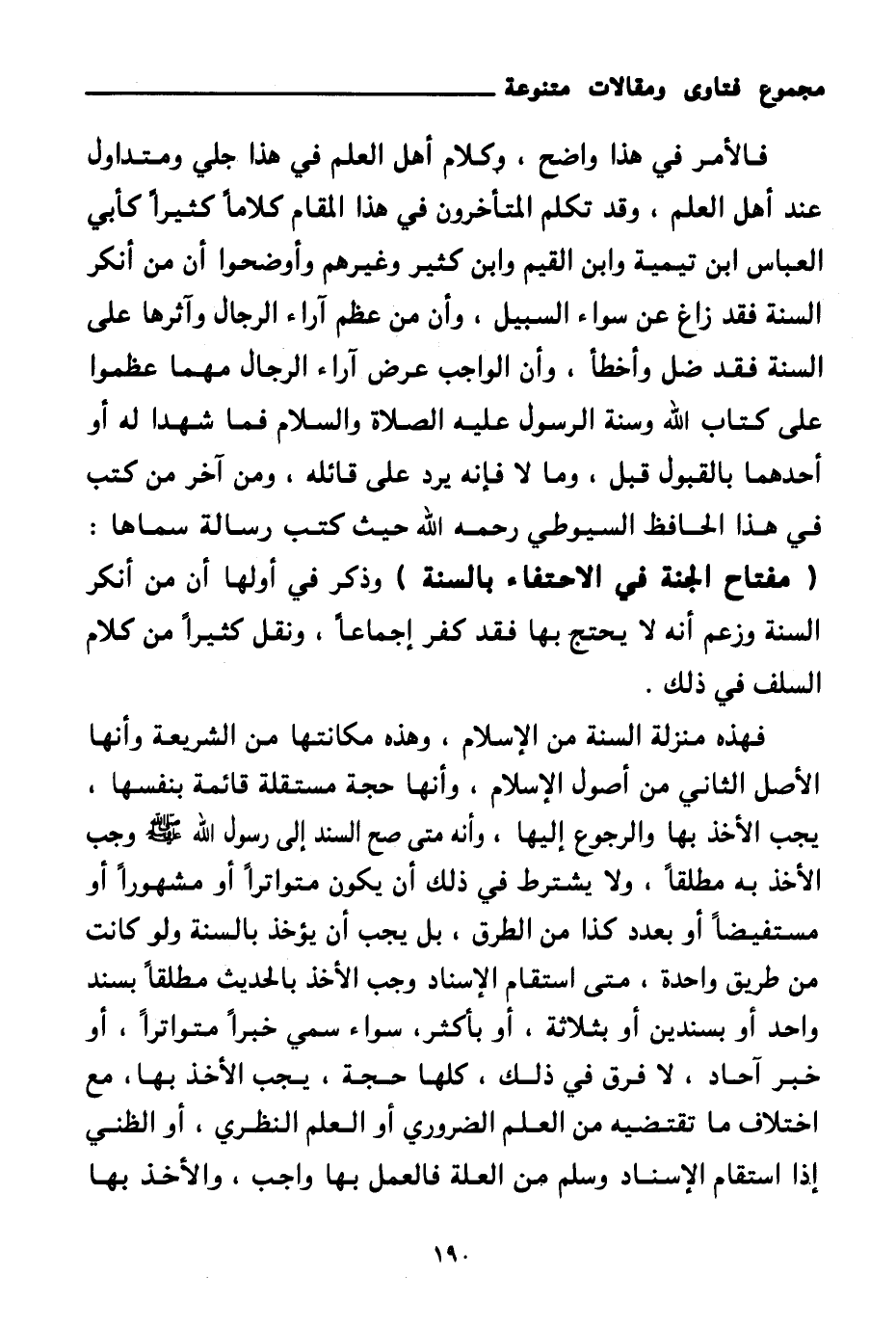 فهذه منزلة السنة من الإسلام، وهذه مكانتها من الشريعة وأنها الأصل الثاني من أصول الإسلام، وأنها حجة مستقلة قائمة بنفسها، يجب الأخذ بها والرجوع إليها، وأنه متى صح السند إلى رسول الله صلى الله عليه وسلم وجب الأخذ به مطلقا، ولا يشترط في ذلك أن يكون متواترا أو مشهورا أو مستفيضا أو بعدد كذا من الطرق. بل يجب أن يؤخذ بالسنة ولو كانت من طريق واحدة، متى استقام الإسناد وجب الأخذ بالحديث مطلقا بسند واحد أو بسندين أو بثلاثة، أو بأكثر، سواء سمي خبرا متواترا، أو خبر آحاد، لا فرق في ذلك، كلها حجة، يجب الأخذ بها، مع اختلاف ما تقتضيه من العلم الضروري أو العلم النظري، أو الظني إذا استقام الإسناد وسلم من العلة فالعمل بها واجب، والأخذ بها