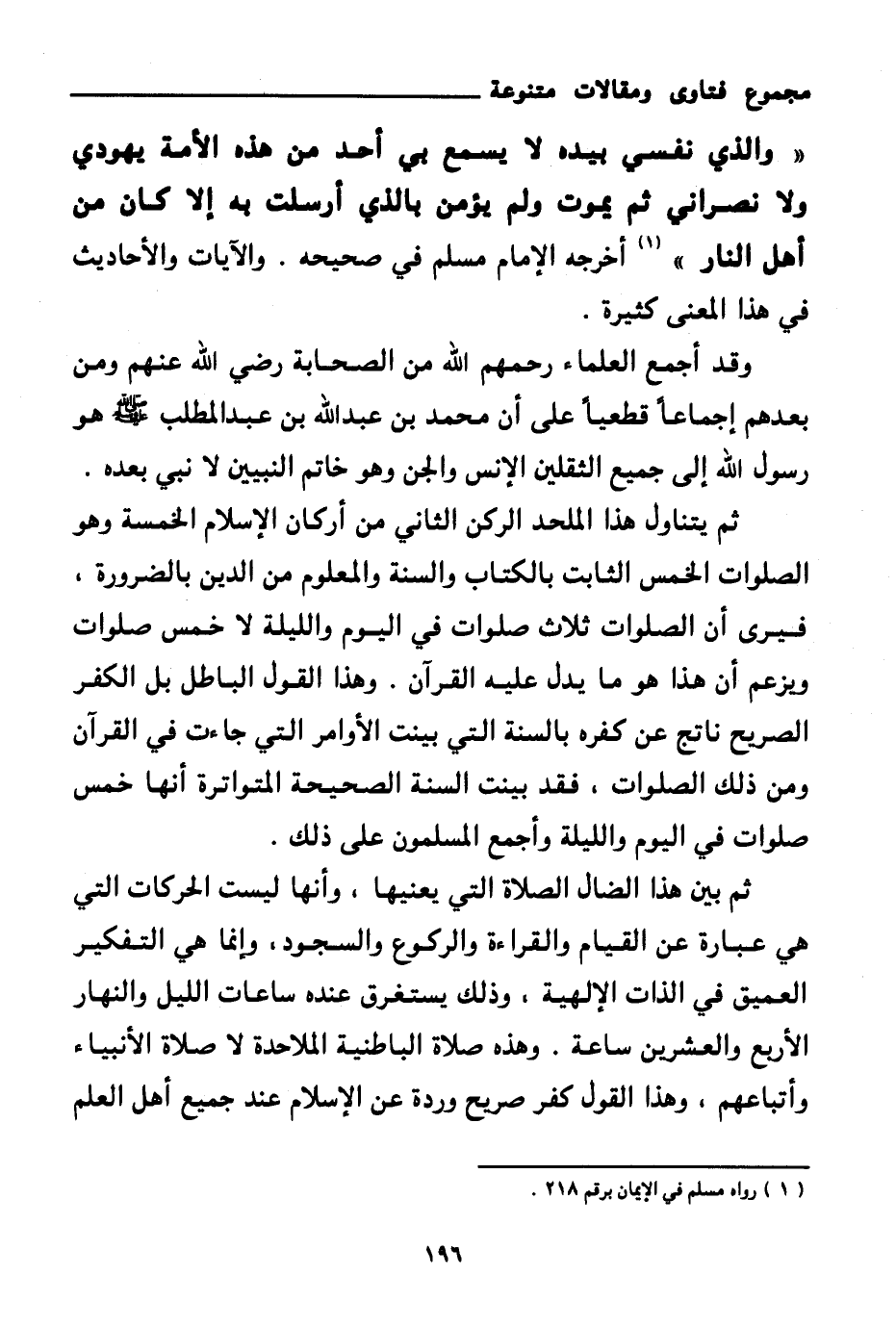 «والذي نفسي بيده لا يسمع بي أحد من هذه الأمة يهودي ولا نصراني ثم يموت ولم يؤمن بالذي أرسلت به إلا كان من أهل النار (¬1) » أخرجه الإمام مسلم في صحيحه. والآيات والأحاديث في هذا المعنى كثيرة.