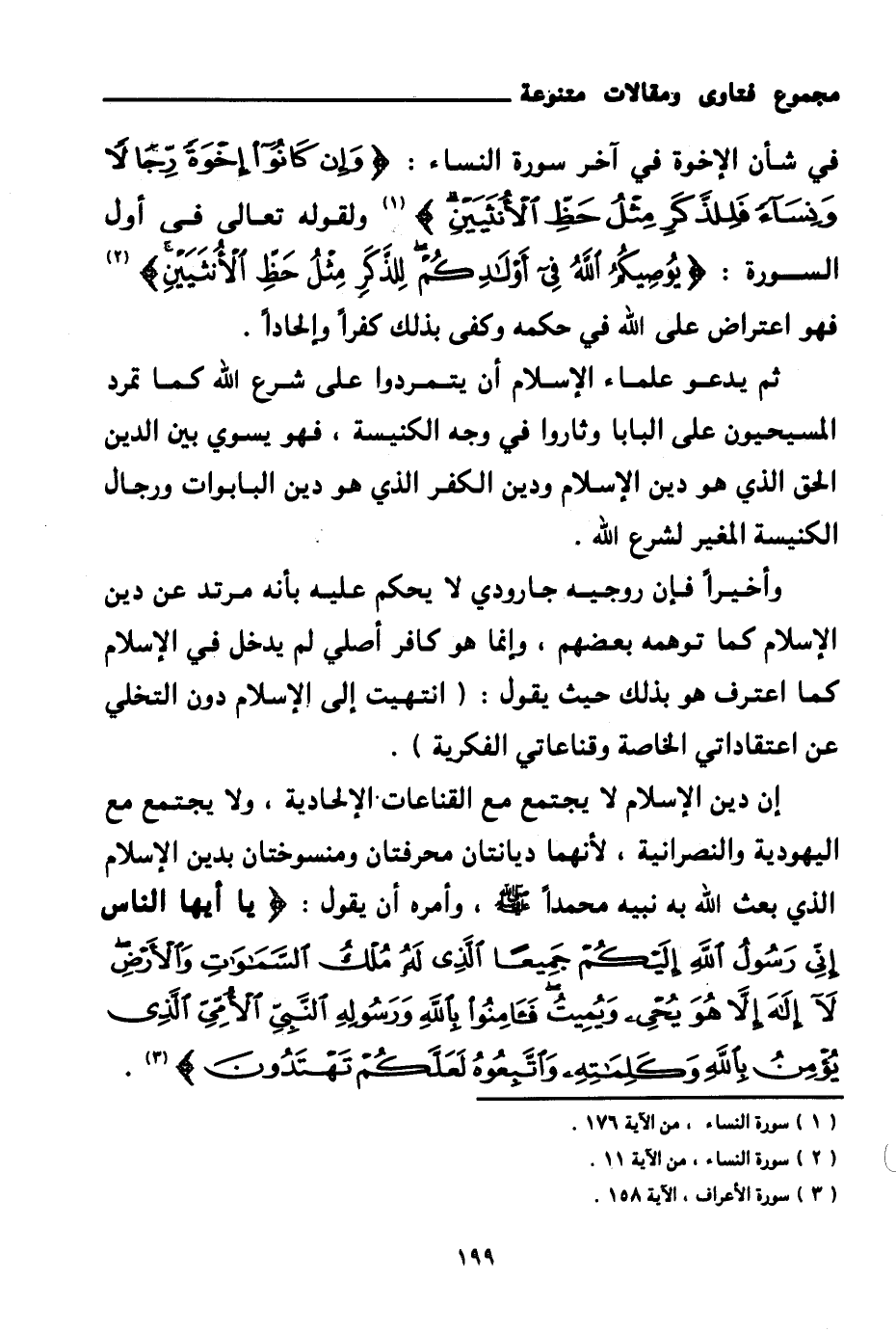 في شأن الإخوة في آخر سورة النساء: {وَإِنْ كَانُوا إِخْوَةً رِجَالًا وَنِسَاءً فَلِلذَّكَرِ مِثْلُ حَظِّ الْأُنْثَيَيْنِ} (¬1) ولقوله تعالى في أول السورة: {يُوصِيكُمُ اللَّهُ فِي أَوْلَادِكُمْ لِلذَّكَرِ مِثْلُ حَظِّ الْأُنْثَيَيْنِ} (¬2) فهو اعتراض على الله في حكمه وكفى بذلك كفرا وإلحادا.