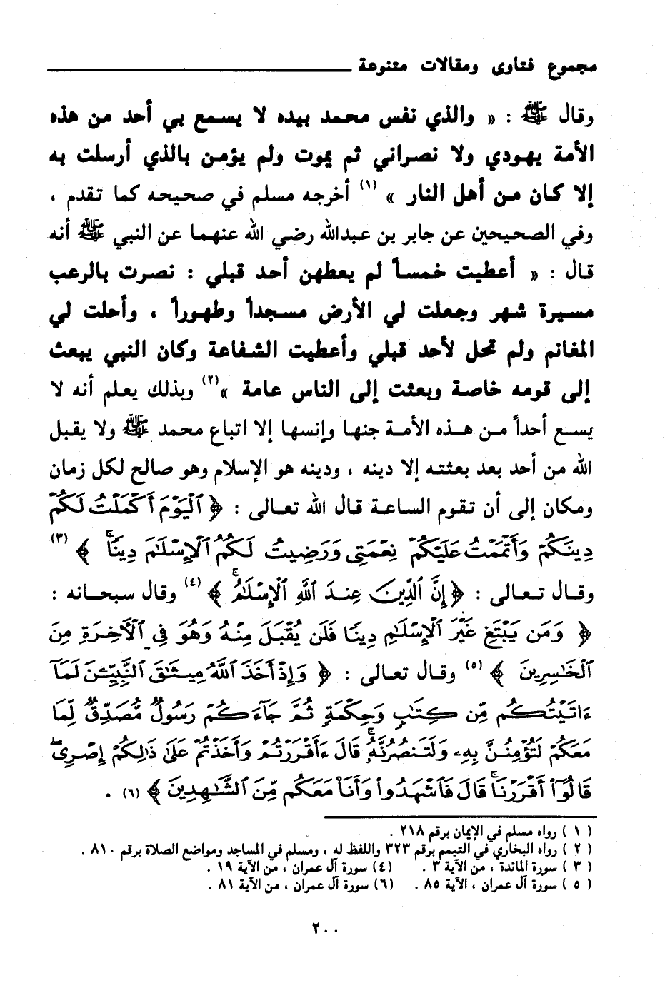 وقال صلى الله عليه وسلم: «والذي نفس محمد بيده لا يسمع بي أحد من هذه الأمة يهودي ولا نصراني ثم يموت ولم يؤمن بالذي أرسلت به إلا كان من أهل النار (¬1) » أخرجه مسلم في صحيحه كما تقدم، وفي الصحيحين عن جابر بن عبد الله رضي الله عنهما عن النبي صلى الله عليه وسلم أنه قال: «أعطيت خمسا لم يعطهن أحد قبلي: نصرت بالرعب مسيرة شهر، وجعلت لي الأرض مسجدا وطهورا، وأحلت لي المغانم ولم تحل لأحد قبلي، وأعطيت الشفاعة، وكان النبي يبعث إلى قومه خاصة وبعثت إلى الناس عامة (¬2) » وبذلك يعلم أنه لا يسع أحدا من هذه الأمة جنها وإنسها إلا اتباع محمد صلى الله عليه وسلم ولا يقبل الله من أحد بعد بعثته إلا دينه، ودينه هو الإسلام وهو صالح لكل زمان ومكان إلى أن تقوم الساعة قال الله تعالى: {الْيَوْمَ أَكْمَلْتُ لَكُمْ دِينَكُمْ وَأَتْمَمْتُ عَلَيْكُمْ نِعْمَتِي وَرَضِيتُ لَكُمُ الْإِسْلَامَ دِينًا} (¬3) وقال تعالى: {إِنَّ الدِّينَ عِنْدَ اللَّهِ الْإِسْلَامُ} (¬4) وقال سبحانه: {وَمَنْ يَبْتَغِ غَيْرَ الْإِسْلَامِ دِينًا فَلَنْ يُقْبَلَ مِنْهُ وَهُوَ فِي الْآخِرَةِ مِنَ الْخَاسِرِينَ} (¬5) وقال تعالى: {وَإِذْ أَخَذَ اللَّهُ مِيثَاقَ النَّبِيِّينَ لَمَا آتَيْتُكُمْ مِنْ كِتَابٍ وَحِكْمَةٍ ثُمَّ جَاءَكُمْ رَسُولٌ مُصَدِّقٌ لِمَا مَعَكُمْ لَتُؤْمِنُنَّ بِهِ وَلَتَنْصُرُنَّهُ قَالَ أَأَقْرَرْتُمْ وَأَخَذْتُمْ عَلَى ذَلِكُمْ إِصْرِي قَالُوا أَقْرَرْنَا قَالَ فَاشْهَدُوا وَأَنَا مَعَكُمْ مِنَ الشَّاهِدِينَ} (¬6)