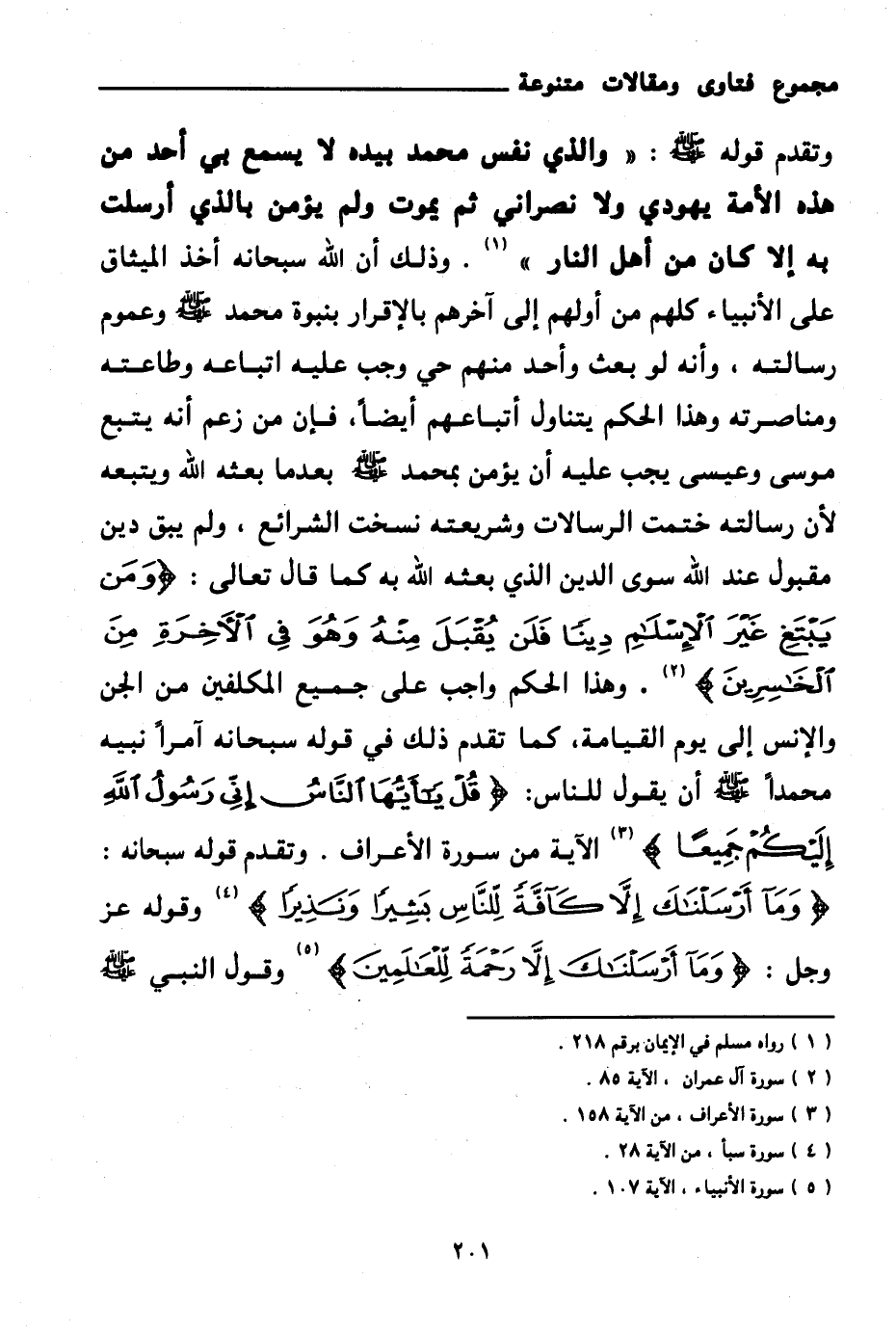 وتقدم قوله صلى الله عليه وسلم: «والذي نفس محمد بيده لا يسمع بي أحد من هذه الأمة يهودي ولا نصراني ثم يموت ولم يؤمن بالذي أرسلت به إلا كان من أهل النار (¬1) » . وذلك أن الله سبحانه أخذ الميثاق على الأنبياء كلهم من أولهم إلى آخرهم بالإقرار بنبوة محمد صلى الله عليه وسلم وعموم رسالته، وأنه لو بعث وأحد منهم حي وجب عليه اتباعه وطاعته ومناصرته وهذا الحكم يتناول أتباعهم أيضا، فإن من زعم أنه يتبع موسى وعيسى يجب عليه أن يؤمن بمحمد صلى الله عليه وسلم بعدما بعثه الله ويتبعه لأن رسالته ختمت الرسالات وشريعته نسخت الشرائع، ولم يبق دين مقبول عند الله سوى الدين الذي بعثه الله به كما قال تعالى: {وَمَنْ يَبْتَغِ غَيْرَ الْإِسْلَامِ دِينًا فَلَنْ يُقْبَلَ مِنْهُ وَهُوَ فِي الْآخِرَةِ مِنَ الْخَاسِرِينَ} (¬2) وهذا الحكم واجب على جميع المكلفين من الجن والإنس إلى يوم القيامة، كما تقدم ذلك في قوله سبحانه آمرا نبيه محمدا صلى الله عليه وسلم أن يقول للناس: {قُلْ يَا أَيُّهَا النَّاسُ إِنِّي رَسُولُ اللَّهِ إِلَيْكُمْ جَمِيعًا} (¬3) الآية من سورة الأعراف. وتقدم قوله سبحانه: {وَمَا أَرْسَلْنَاكَ إِلَّا كَافَّةً لِلنَّاسِ بَشِيرًا وَنَذِيرًا} (¬4) وقوله عز وجل: {وَمَا أَرْسَلْنَاكَ إِلَّا رَحْمَةً لِلْعَالَمِينَ} (¬5) وقول النبي صلى الله عليه وسلم: