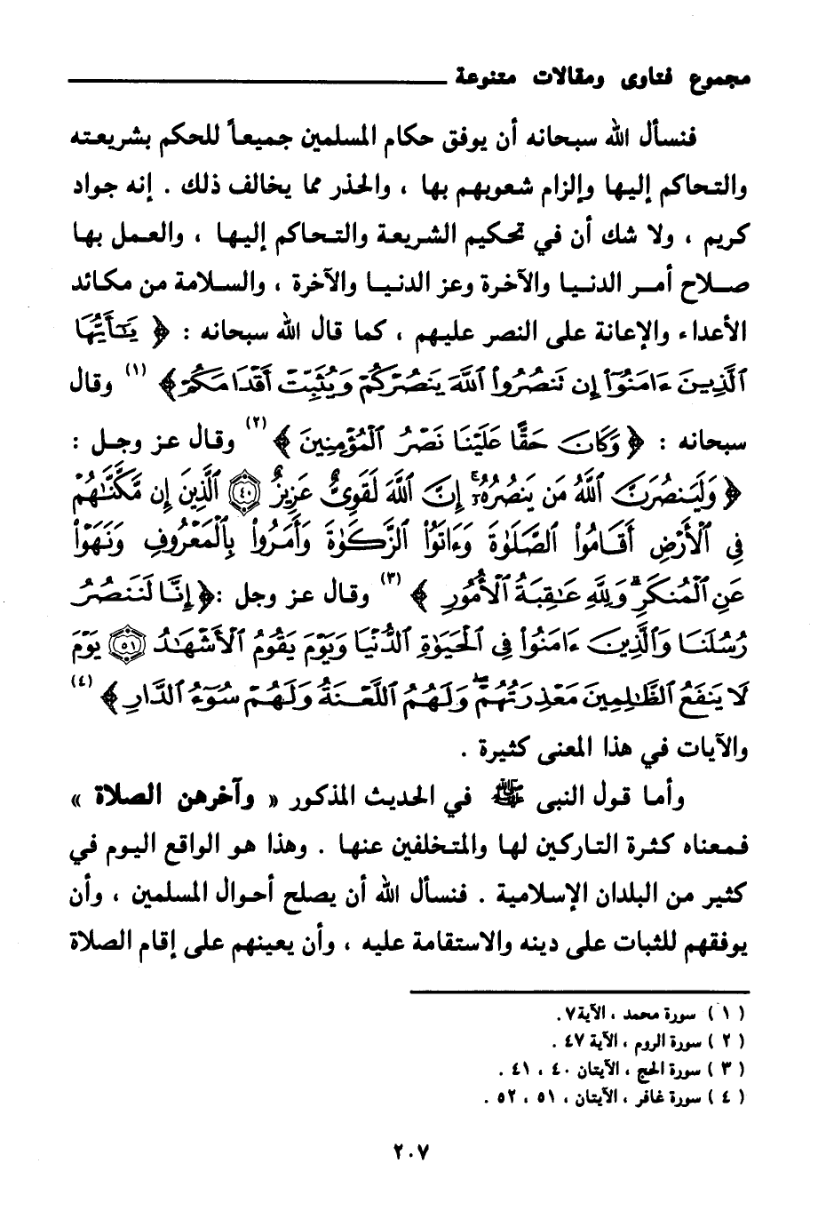 فنسأل الله سبحانه أن يوفق حكام المسلمين جميعا للحكم بشريعته والتحاكم إليها وإلزام شعوبهم بها، والحذر مما يخالف ذلك. إنه جواد كريم، ولا شك أن في تحكيم الشريعة والتحاكم إليها، والعمل بها صلاح أمر الدنيا والآخرة وعز الدنيا والآخرة، والسلامة من مكائد الأعداء والإعانة على النصر عليهم. كما قال الله سبحانه: {يَا أَيُّهَا الَّذِينَ آمَنُوا إِنْ تَنْصُرُوا اللَّهَ يَنْصُرْكُمْ وَيُثَبِّتْ أَقْدَامَكُمْ} (¬1) وقال سبحانه: {وَكَانَ حَقًّا عَلَيْنَا نَصْرُ الْمُؤْمِنِينَ} (¬2) وقال عز وجل: {وَلَيَنْصُرَنَّ اللَّهُ مَنْ يَنْصُرُهُ إِنَّ اللَّهَ لَقَوِيٌّ عَزِيزٌ} (¬3) {الَّذِينَ إِنْ مَكَّنَّاهُمْ فِي الْأَرْضِ أَقَامُوا الصَّلَاةَ وَآتَوُا الزَّكَاةَ وَأَمَرُوا بِالْمَعْرُوفِ وَنَهَوْا عَنِ الْمُنْكَرِ وَلِلَّهِ عَاقِبَةُ الْأُمُورِ} (¬4) وقال عز وجل: {إِنَّا لَنَنْصُرُ رُسُلَنَا وَالَّذِينَ آمَنُوا فِي الْحَيَاةِ الدُّنْيَا وَيَوْمَ يَقُومُ الْأَشْهَادُ} (¬5) {يَوْمَ لَا يَنْفَعُ الظَّالِمِينَ مَعْذِرَتُهُمْ وَلَهُمُ اللَّعْنَةُ وَلَهُمْ سُوءُ الدَّارِ} (¬6) والآيات في هذا المعنى كثيرة.