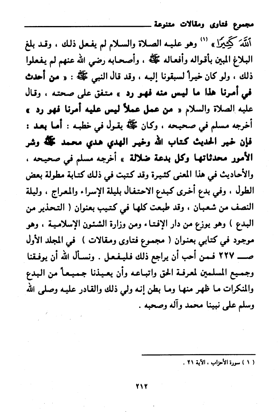 وهو عليه الصلاة والسلام لم يفعل ذلك، وقد بلغ البلاغ المبين بأقواله وأفعاله صلى الله عليه وسلم، وأصحابه رضي الله عنهم لم يفعلوا ذلك، ولو كان خيرا لسبقونا إليه، وقد قال النبي صلى الله عليه وسلم: «من أحدث في أمرنا هذا ما ليس منه فهو رد (¬1) » متفق على صحته، وقال عليه الصلاة والسلام «من عمل عملا ليس عليه أمرنا فهو رد (¬2) » أخرجه مسلم في صحيحه، وكان صلى الله عليه وسلم يقول في خطبه: «أما بعد فإن خير الحديث كتاب الله وخير الهدي هدي محمد صلى الله عليه وسلم، وشر الأمور محدثاتها، وكل بدعة ضلالة (¬3) » أخرجه مسلم في صحيحه. والأحاديث في هذا المعنى كثيرة وقد كتبت في ذلك كتابة مطولة بعض الطول، وفي بدع أخرى كبدع الاحتفال بليلة الإسراء والمعراج، وليلة النصف من شعبان، وقد طبعت كلها في كتيب بعنوان (التحذير من البدع) وهو يوزع من دار الإفتاء ومن وزارة الشئون الإسلامية، وهو موجود في كتابي بعنوان (مجموع فتاوى ومقالات) في المجلد الأول صـ 227 فمن أحب أن يراجع ذلك فليفعل. ونسأل الله أن يوفقنا وجميع المسلمين لمعرفة الحق واتباعه وأن يعيذنا جميعا من البدع والمنكرات ما ظهر منها وما بطن إنه ولي ذلك والقادر عليه وصلى الله وسلم على نبينا محمد وآله وصحبه.