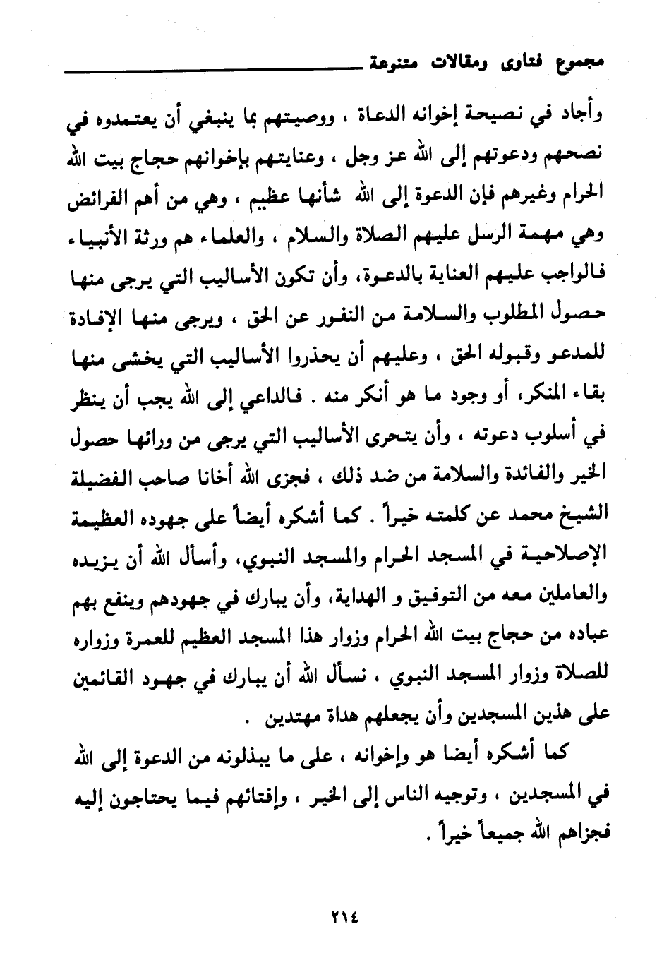 كما أشكره أيضا هو وإخوانه، على ما يبذلونه من الدعوة إلى الله في المسجدين، وتوجيه الناس إلى الخير، وإفتائهم فيما يحتاجون إليه فجزاهم الله جميعا خيرا.
