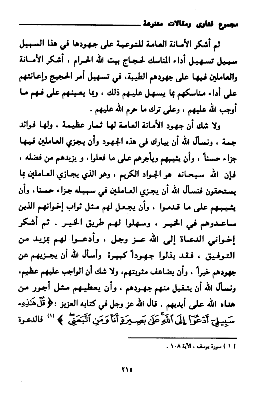 ثم أشكر إخواني الدعاة إلى الله عز وجل، وأدعو لهم بمزيد من التوفيق، فقد بذلوا جهودا كبيرة وأسأل الله أن يجزيهم عن جهودهم خيرا، وأن يضاعف مثوبتهم، ولا شك أن الواجب عليهم عظيم، ونسأل الله أن يتقبل منهم جهودهم، وأن يعطيهم مثل أجور من هداه الله على أيديهم. قال الله عز وجل في كتابه العزيز: {قُلْ هَذِهِ سَبِيلِي أَدْعُو إِلَى اللَّهِ عَلَى بَصِيرَةٍ أَنَا وَمَنِ اتَّبَعَنِي} (¬1) فالدعوة