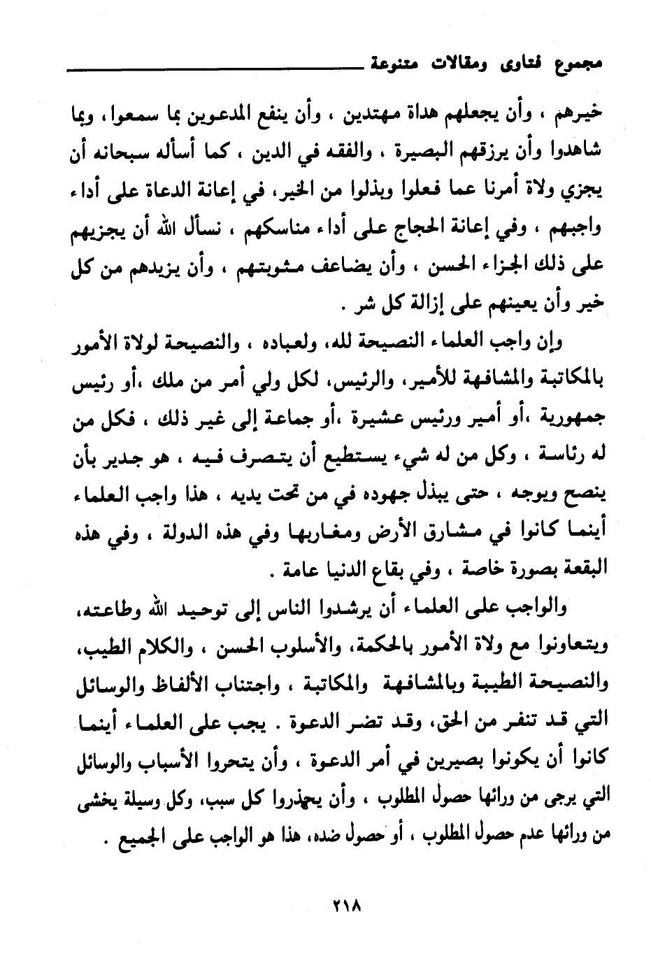 وإن واجب العلماء النصيحة لله، ولعباده، والنصيحة لولاة الأمور بالمكاتبة والمشافهة للأمير، والرئيس، لكل ولي أمر من ملك، أو رئيس جمهورية، أو أمير ورئيس عشيرة، أو جماعة إلى غير ذلك، فكل من له رئاسة، وكل من له شيء يستطيع أن يتصرف فيه، هو جدير بأن ينصح ويوجه، حتى يبذل جهوده في من تحت يديه، هذا واجب العلماء أينما كانوا في مشارق الأرض ومغاربها وفي هذه الدولة، وفي هذه البقعة بصورة خاصة، وفي بقاع الدنيا عامة.