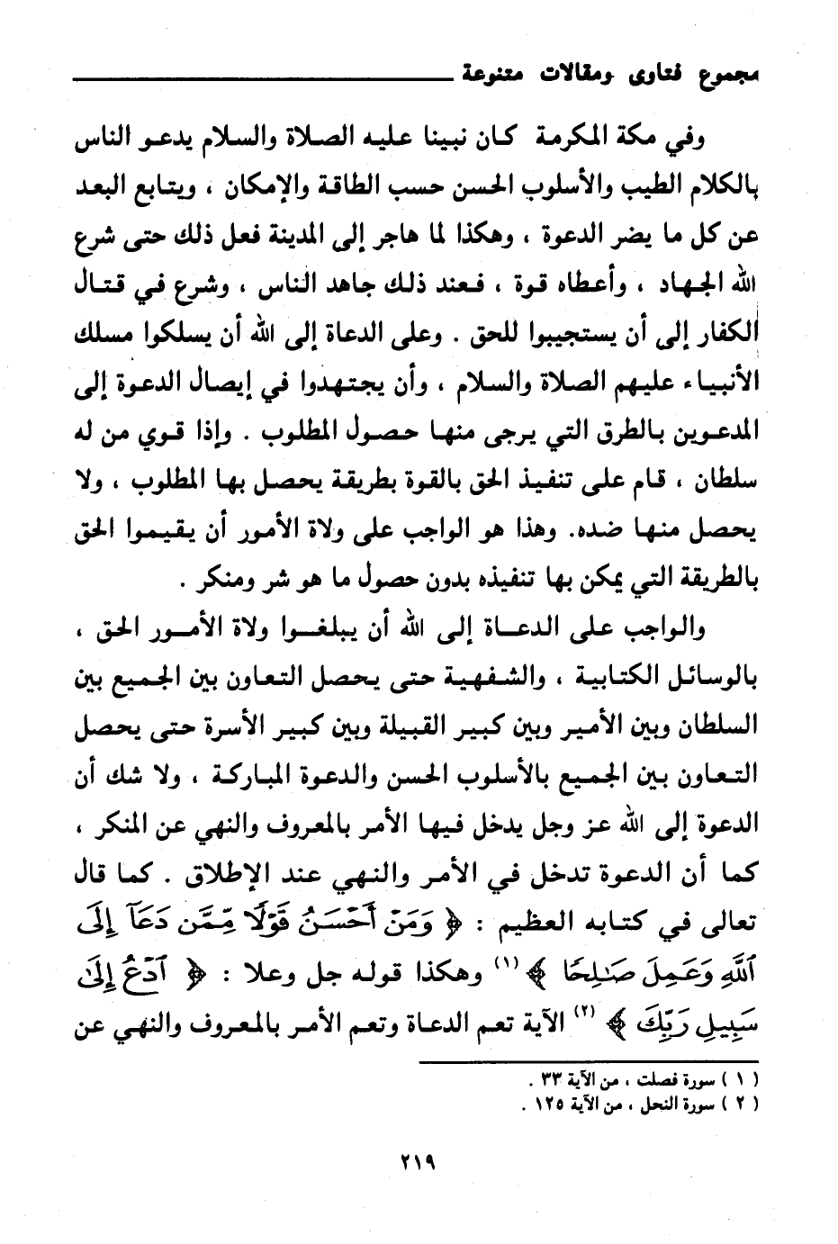 والواجب على الدعاة إلى الله أن يبلغوا ولاة الأمور الحق، بالوسائل الكتابية، والشفهية حتى يحصل التعاون بين الجميع بين السلطان وبين الأمير وبين كبير القبيلة وبين كبير الأسرة حتى يحصل التعاون بين الجميع بالأسلوب الحسن والدعوة المباركة، ولا شك أن الدعوة إلى الله عز وجل يدخل فيها الأمر بالمعروف والنهي عن المنكر، كما أن الدعوة تدخل في الأمر والنهي عند الإطلاق. كما قال تعالى في كتابه العظيم: {وَمَنْ أَحْسَنُ قَوْلًا مِمَّنْ دَعَا إِلَى اللَّهِ وَعَمِلَ صَالِحًا} (¬1) وهكذا قوله جل وعلا: {ادْعُ إِلَى سَبِيلِ رَبِّكَ} (¬2) الآية تعم الدعاة وتعم الأمر بالمعروف والنهي عن