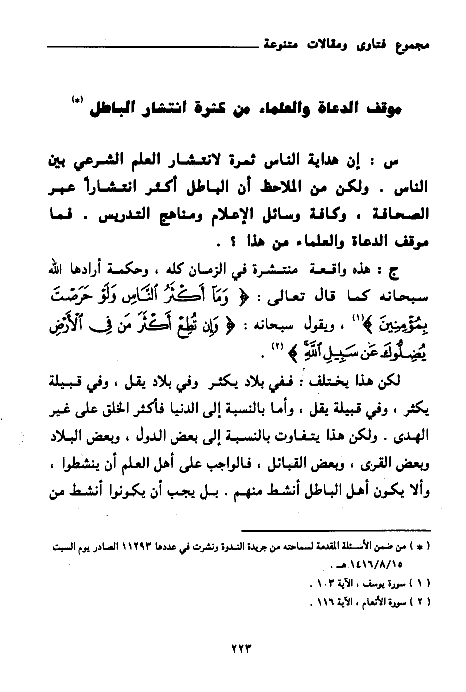 ج: هذه واقعة منتشرة في الزمان كله، وحكمة أرادها الله سبحانه كما قال تعالى: {وَمَا أَكْثَرُ النَّاسِ وَلَوْ حَرَصْتَ بِمُؤْمِنِينَ} (¬1) ويقول سبحانه: {وَإِنْ تُطِعْ أَكْثَرَ مَنْ فِي الْأَرْضِ يُضِلُّوكَ عَنْ سَبِيلِ اللَّهِ} (¬2) لكن هذا يختلف: ففي بلاد يكثر وفي بلاد يقل، وفي قبيلة يكثر، وفي قبيلة يقل، وأما بالنسبة إلى الدنيا فأكثر الخلق على غير الهدى. ولكن هذا يتفاوت بالنسبة إلى بعض الدول، وبعض البلاد، وبعض القرى، وبعض القبائل، فالواجب على أهل العلم أن ينشطوا، وألا يكون أهل الباطل أنشط منهم. بل يجب أن يكونوا أنشط من