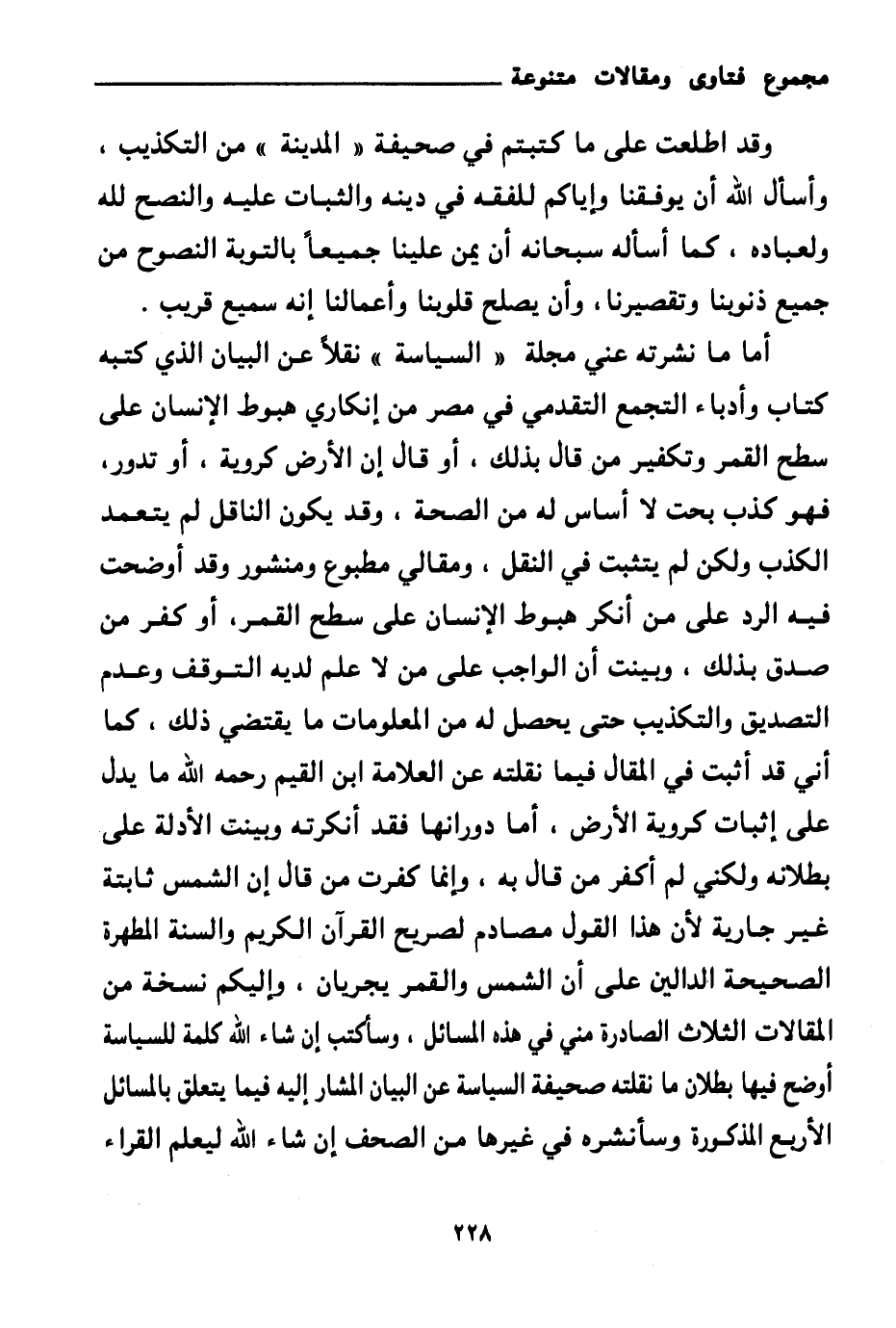 أما ما نشرته عني مجلة " السياسة " نقلا عن البيان الذي كتبه كتاب وأدباء التجمع التقدمي في مصر من إنكاري هبوط الإنسان على سطح القمر وتكفير من قال بذلك، أو قال إن الأرض كروية، أو تدور، فهو كذب بحت لا أساس له من الصحة، وقد يكون الناقل لم يتعمد الكذب ولكن لم يتثبت في النقل، ومقالي مطبوع ومنشور وقد أوضحت فيه الرد على من أنكر هبوط الإنسان على سطح القمر، أو كفر من صدق بذلك، وبينت أن الواجب على من لا علم لديه التوقف وعدم التصديق والتكذيب حتى يحصل له من المعلومات ما يقتضي ذلك. كما أني قد أثبت في المقال فيما نقلته عن العلامة ابن القيم رحمه الله ما يدل على إثبات كروية الأرض، أما دورانها فقد أنكرته وبينت الأدلة على بطلانه ولكني لم أكفر من قال به، وإنما كفرت من قال إن الشمس ثابتة غير جارية لأن هذا القول مصادم لصريح القرآن الكريم والسنة المطهرة الصحيحة الدالين على أن الشمس والقمر يجريان، وإليكم نسخة من المقالات الثلاث الصادرة مني في هذه المسائل، وسأكتب إن شاء الله كلمة للسياسة أوضح فيها بطلان ما نقلته صحيفة السياسة عن البيان المشار إليه فيما يتعلق بالمسائل الأربع المذكورة وسأنشره في غيرها من الصحف إن شاء الله ليعلم القراء