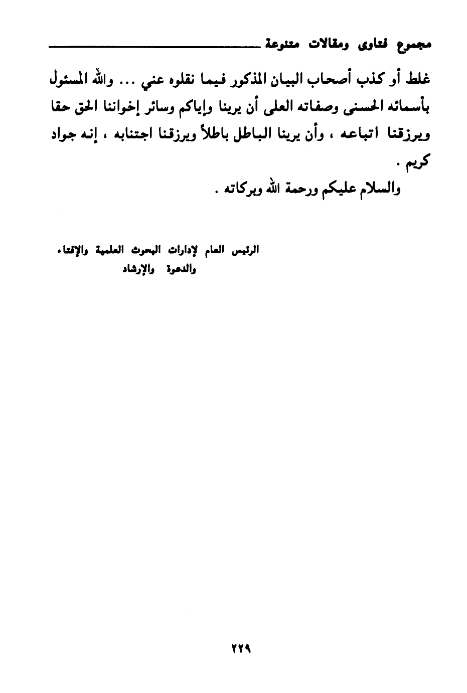 غلط أو كذب أصحاب البيان المذكور فيما نقلوه عني.... والله المسئول بأسمائه الحسنى وصفاته العلى أن يرينا وإياكم وسائر إخواننا الحق حقا ويرزقنا اتباعه، وأن يرينا الباطل باطلا ويرزقنا اجتنابه، إنه جواد كريم.