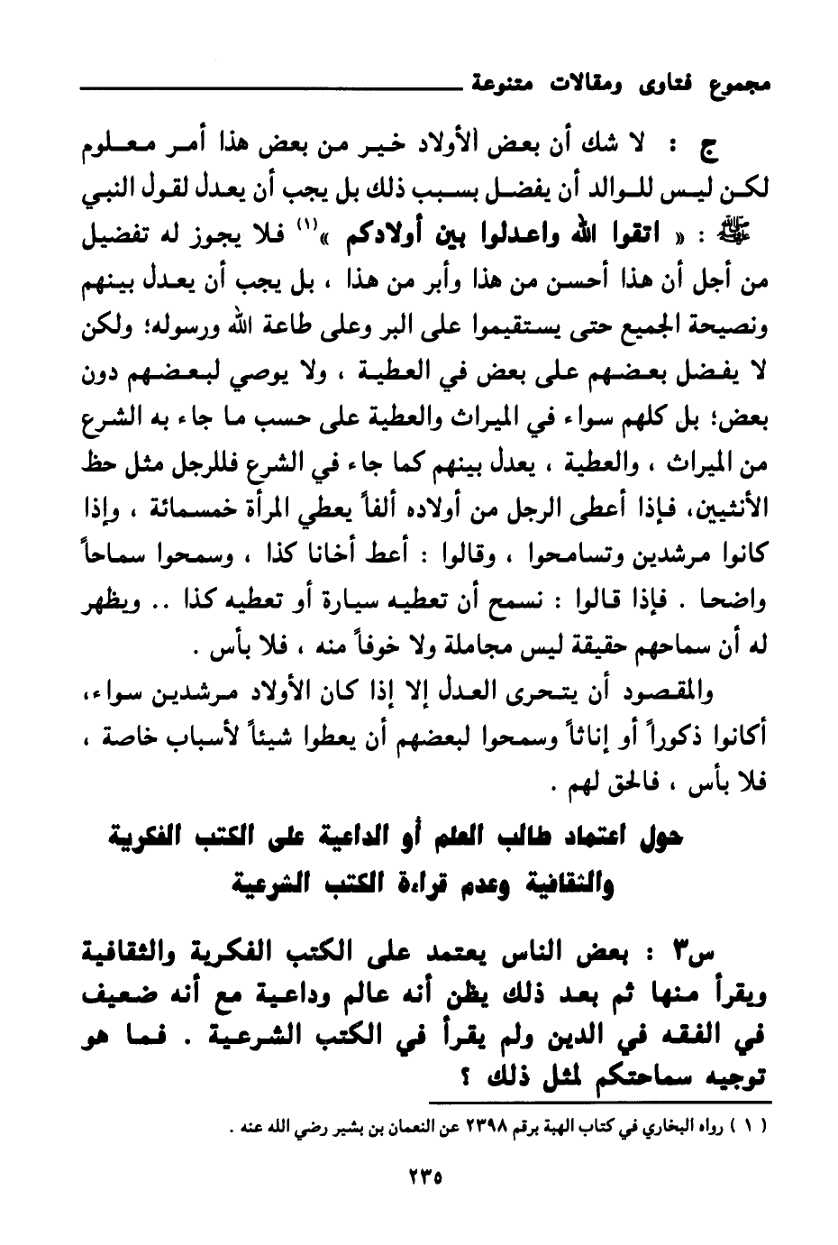 (¬1) رواه البخاري في كتاب الهبة برقم 2398 عن النعمان بن بشير رضي الله عنه.