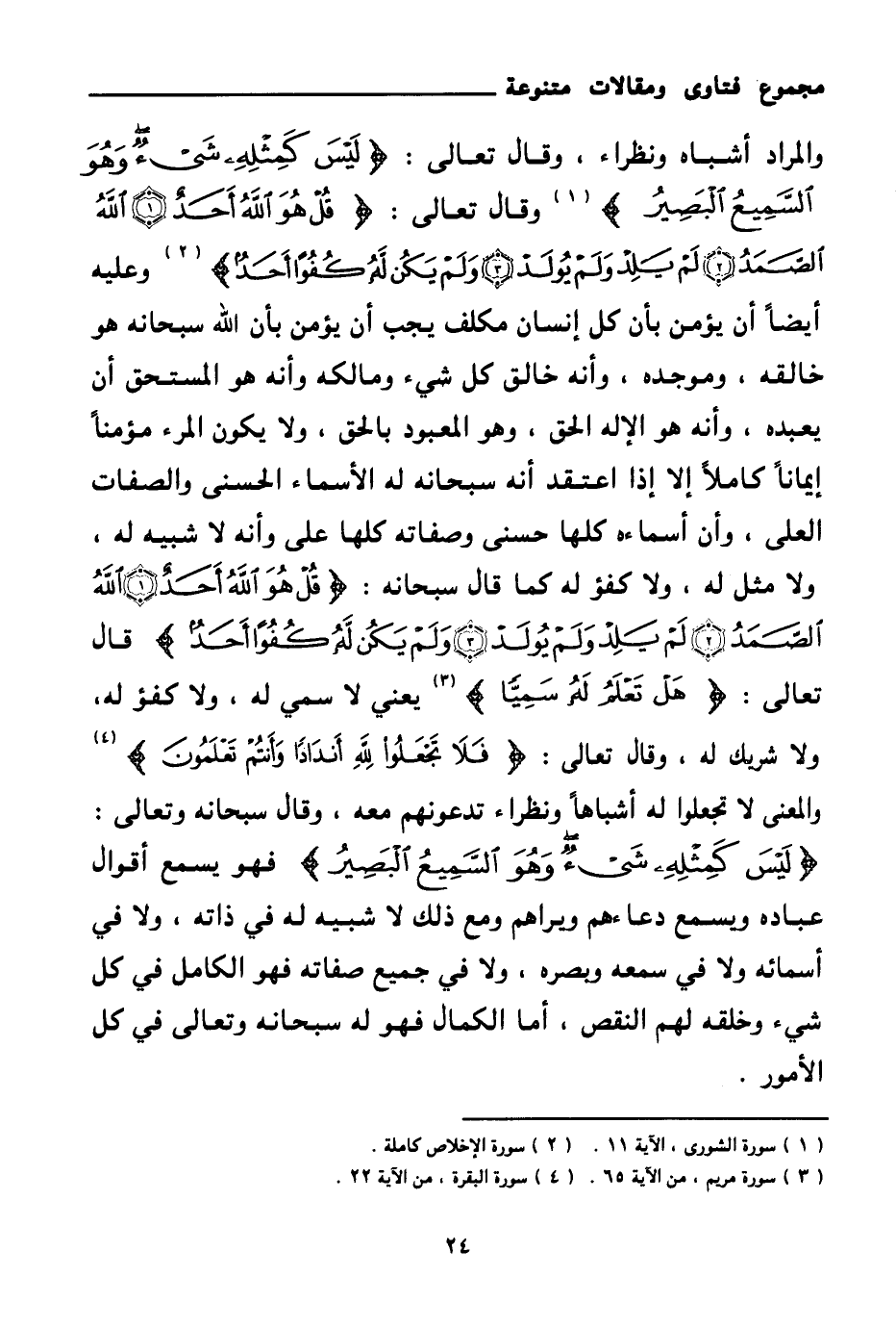 وعليه أيضا أن يؤمن بأن كل إنسان مكلف يجب أن يؤمن بأن الله سبحانه هو خالقه، وموجده، وأنه خالق كل شيء ومالكه وأنه هو المستحق أن يعبده، وأنه هو الإله الحق، وهو المعبود بالحق، ولا يكون المرء مؤمنا إيمانا كاملا إلا إذا اعتقد أنه سبحانه له الأسماء الحسنى والصفات العلى، وأن أسماءه كلها حسنى وصفاته كلها على وأنه لا شبيه له، ولا مثل له، ولا كفو له كما قال سبحانه: {قُلْ هُوَ اللَّهُ أَحَدٌ} (¬6) {اللَّهُ الصَّمَدُ} (¬7) {لَمْ يَلِدْ وَلَمْ يُولَدْ} (¬8) {وَلَمْ يَكُنْ لَهُ كُفُوًا أَحَدٌ} (¬9) قال تعالى: {هَلْ تَعْلَمُ لَهُ سَمِيًّا} (¬10) يعني لا سمي له، ولا كفو له، ولا شريك له. وقال تعالى: {فَلَا تَجْعَلُوا لِلَّهِ أَنْدَادًا وَأَنْتُمْ تَعْلَمُونَ} (¬11) والمعنى لا تجعلوا له أشباها ونظراء تدعونهم معه.