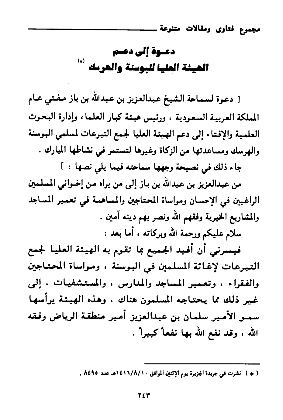 [دعوة لسماحة الشيخ عبد العزيز بن عبد الله بن باز مفتي عام المملكة العربية السعودية، ورئيس هيئة كبار العلماء وإدارة البحوث العلمية والإفتاء إلى دعم الهيئة العليا لجمع التبرعات لمسلمي البوسنة والهرسك ومساعدتها من الزكاة وغيرها لتستمر في نشاطها المبارك.