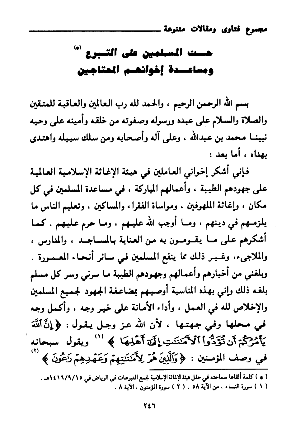 (¬1) كلمة ألقاها سماحته في حفل هيئة الإغاثة الإسلامية لجمع التبرعات في الرياض في 15 \ 9 \ 1416هـ.