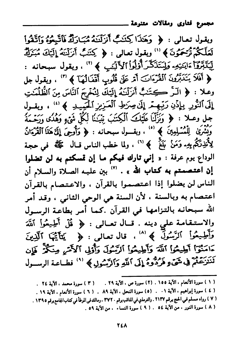 ويقول جل وعلا: {وَنَزَّلْنَا عَلَيْكَ الْكِتَابَ تِبْيَانًا لِكُلِّ شَيْءٍ وَهُدًى وَرَحْمَةً وَبُشْرَى لِلْمُسْلِمِينَ} (¬5) ويقول سبحانه: {وَأُوحِيَ إِلَيَّ هَذَا الْقُرْآنُ لِأُنْذِرَكُمْ بِهِ وَمَنْ بَلَغَ} (¬6) ولما خطب الناس قال صلى الله عليه وسلم في حجة الوداع يوم عرفة: «إني تارك فيكم ما إن تمسكتم به لن تضلوا إن اعتصمتم به كتاب الله (¬7) » . بين عليه الصلاة والسلام أن الناس لن يضلوا إذا اعتصموا بالقرآن، والاعتصام بالقرآن اعتصام به وبالسنة؛ لأن السنة هي الوحي الثاني، وقد أمر الله سبحانه بالتزامها في القرآن. كما أمر بطاعة الرسول والاستقامة على دينه. قال تعالى: {قُلْ أَطِيعُوا اللَّهَ وَأَطِيعُوا الرَّسُولَ} (¬8) قال تعالى: {يَا أَيُّهَا الَّذِينَ آمَنُوا أَطِيعُوا اللَّهَ وَأَطِيعُوا الرَّسُولَ وَأُولِي الْأَمْرِ مِنْكُمْ فَإِنْ تَنَازَعْتُمْ فِي شَيْءٍ فَرُدُّوهُ إِلَى اللَّهِ وَالرَّسُولِ} (¬9) فطاعة الرسول