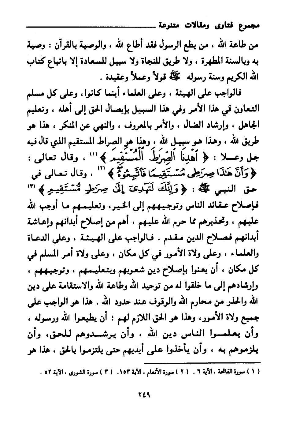فالواجب على الهيئة، وعلى العلماء أينما كانوا، وعلى كل مسلم التعاون في هذا الأمر وفي هذا السبيل بإيصال الحق إلى أهله، وتعليم الجاهل، وإرشاد الضال، والأمر بالمعروف، والنهي عن المنكر، هذا هو طريق الله، وهذا هو سبيل الله، وهذا هو الصراط المستقيم الذي قال فيه جل وعلا: {اهْدِنَا الصِّرَاطَ الْمُسْتَقِيمَ} (¬1) وقال تعالى: {وَأَنَّ هَذَا صِرَاطِي مُسْتَقِيمًا فَاتَّبِعُوهُ} (¬2) وقال تعالى في حق النبي صلى الله عليه وسلم: {وَإِنَّكَ لَتَهْدِي إِلَى صِرَاطٍ مُسْتَقِيمٍ} (¬3)