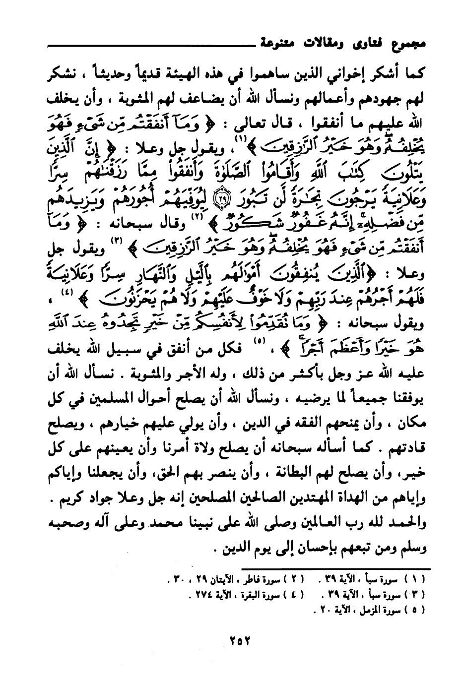 كما أشكر إخواني الذين ساهموا في هذه الهيئة قديما وحديثا، نشكر لهم جهودهم وأعمالهم ونسأل الله أن يضاعف لهم المثوبة، وأن يخلف الله عليهم ما أنفقوا، قال تعالى: {وَمَا أَنْفَقْتُمْ مِنْ شَيْءٍ فَهُوَ يُخْلِفُهُ وَهُوَ خَيْرُ الرَّازِقِينَ} (¬1) ويقول جل وعلا: {إِنَّ الَّذِينَ يَتْلُونَ كِتَابَ اللَّهِ وَأَقَامُوا الصَّلَاةَ وَأَنْفَقُوا مِمَّا رَزَقْنَاهُمْ سِرًّا وَعَلَانِيَةً يَرْجُونَ تِجَارَةً لَنْ تَبُورَ} (¬2) {لِيُوَفِّيَهُمْ أُجُورَهُمْ وَيَزِيدَهُمْ مِنْ فَضْلِهِ إِنَّهُ غَفُورٌ شَكُورٌ} (¬3) وقال سبحانه: {وَمَا أَنْفَقْتُمْ مِنْ شَيْءٍ فَهُوَ يُخْلِفُهُ وَهُوَ خَيْرُ الرَّازِقِينَ} (¬4) ويقول جل وعلا: {الَّذِينَ يُنْفِقُونَ أَمْوَالَهُمْ بِاللَّيْلِ وَالنَّهَارِ سِرًّا وَعَلَانِيَةً فَلَهُمْ أَجْرُهُمْ عِنْدَ رَبِّهِمْ وَلَا خَوْفٌ عَلَيْهِمْ وَلَا هُمْ يَحْزَنُونَ} (¬5) ويقول سبحانه: {وَمَا تُقَدِّمُوا لِأَنْفُسِكُمْ مِنْ خَيْرٍ تَجِدُوهُ عِنْدَ اللَّهِ هُوَ خَيْرًا وَأَعْظَمَ أَجْرًا} (¬6) فكل من أنفق في سبيل الله يخلف عليه الله عز وجل بأكثر من ذلك، وله الأجر والمثوبة.