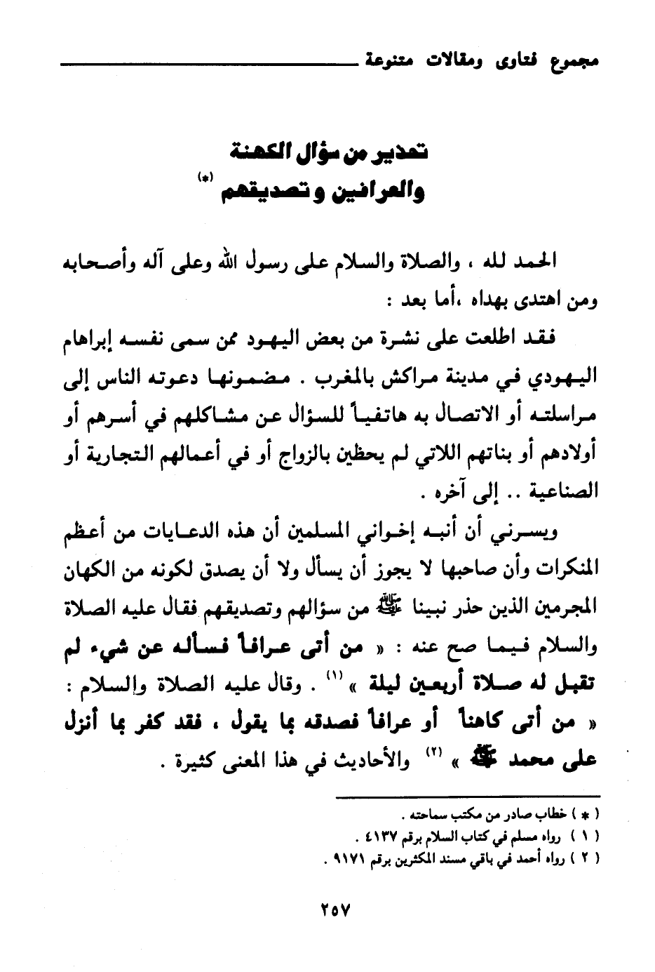 ويسرني أن أنبه إخواني المسلمين أن هذه الدعايات من أعظم المنكرات وأن صاحبها لا يجوز أن يسأل ولا أن يصدق لكونه من الكهان المجرمين الذين حذر نبينا صلى الله عليه وسلم من سؤالهم وتصديقهم فقال عليه الصلاة والسلام فيما صح عنه: «من أتى عرافا فسأله عن شيء لم تقبل له صلاة أربعين ليلة (¬2) » . وقال عليه الصلاة والسلام: «من أتى كاهنا أو عرافا فصدقه بما يقول فقد كفر بما أنزل على محمد صلى الله عليه وسلم (¬3) » والأحاديث في هذا المعنى كثيرة.