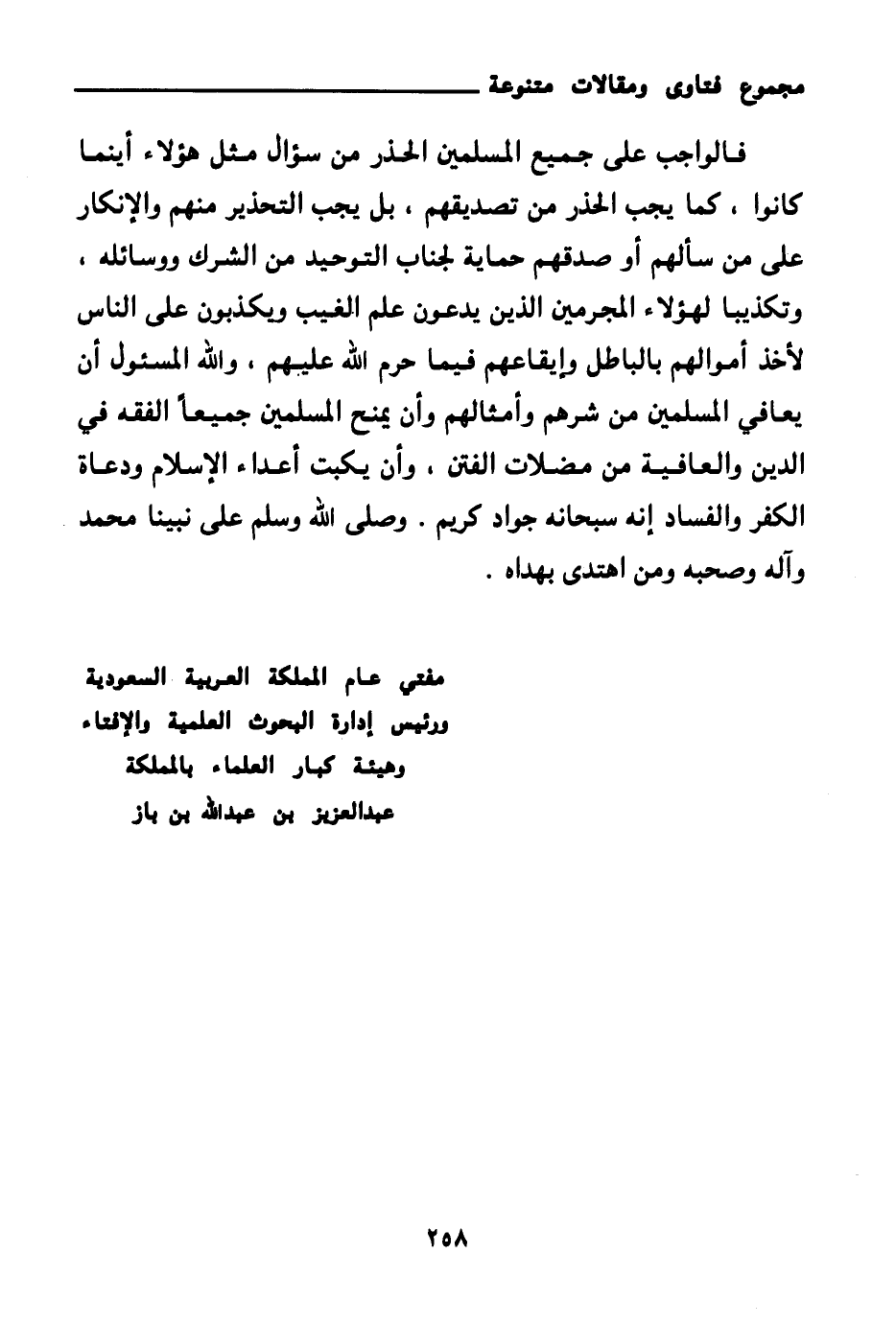 فالواجب على جميع المسلمين الحذر من سؤال مثل هؤلاء أينما كانوا، كما يجب الحذر من تصديقهم، بل يجب التحذير منهم والإنكار على من سألهم أو صدقهم حماية لجناب التوحيد من الشرك ووسائله، وتكذيبا لهؤلاء المجرمين الذين يدعون علم الغيب ويكذبون على الناس لأخذ أموالهم بالباطل وإيقاعهم فيما حرم الله عليهم، والله المسئول أن يعافي المسلمين من شرهم وأمثالهم وأن يمنح المسلمين جميعا الفقه في الدين والعافية من مضلات الفتن، وأن يكبت أعداء الإسلام ودعاة الكفر والفساد إنه سبحانه جواد كريم. وصلى الله وسلم على نبينا محمد وآله وصحبه ومن اهتدى بهداه.