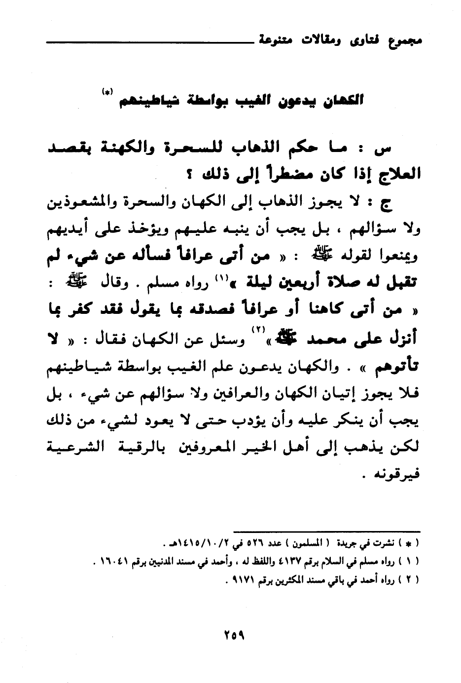 ج: لا يجوز الذهاب إلى الكهان والسحرة والمشعوذين ولا سؤالهم، بل يجب أن ينبه عليهم ويؤخذ على أيديهم ويمنعوا لقوله صلى الله عليه وسلم: «من أتى عرافا فسأله عن شيء لم تقبل له صلاة أربعين ليلة (¬2) » رواه مسلم. وقال صلى الله عليه وسلم: «من أتى كاهنا أو عرافا فصدقه بما يقول فقد كفر بما أنزل على محمد (¬3) » وسئل عن الكهان فقال: «لا تأتوهم (¬4) » .