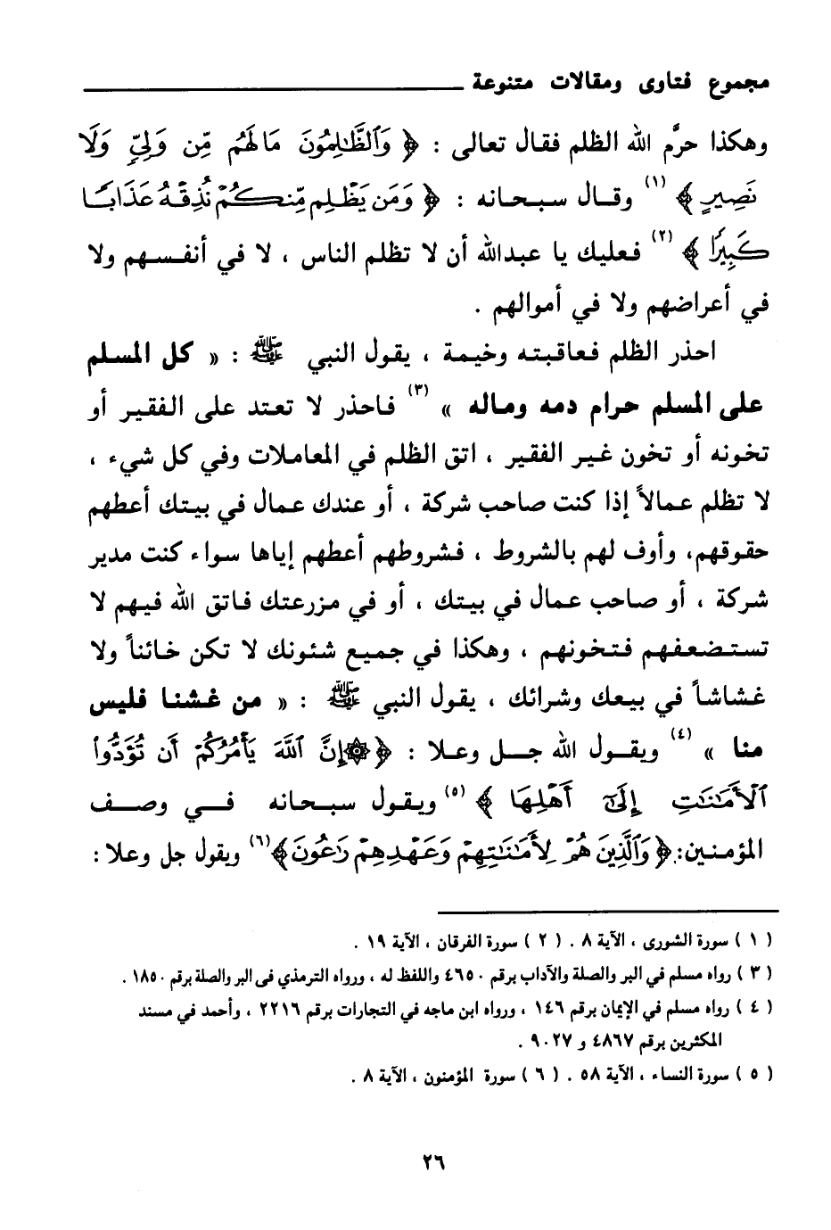 احذر الظلم فعاقبته وخيمة، يقول النبي صلى الله عليه وسلم: «كل المسلم على المسلم حرام دمه وماله (¬1) » فاحذر لا تعتد على الفقير أو تخونه أو تخون غير الفقير، اتق الظلم في المعاملات وفي كل شيء، لا تظلم عمالا إذا كنت صاحب شركة، أو عندك عمال في بيتك أعطهم حقوقهم، وأوف لهم بالشروط، فشروطهم أعطهم إياها سواء كنت مدير شركة، أو صاحب عمال في بيتك، أو في مزرعتك فاتق الله فيهم لا تستضعفهم فتخونهم، وهكذا في جميع شئونك لا تكن خائنا ولا غشاشا في بيعك وشرائك، يقول النبي صلى الله عليه وسلم: «من غشنا فليس منا (¬2) » ويقول الله جل وعلا: {إِنَّ اللَّهَ يَأْمُرُكُمْ أَنْ تُؤَدُّوا الْأَمَانَاتِ إِلَى أَهْلِهَا} (¬3) ويقول سبحانه في وصف المؤمنين: {وَالَّذِينَ هُمْ لِأَمَانَاتِهِمْ وَعَهْدِهِمْ رَاعُونَ} (¬4) ويقول جل وعلا: