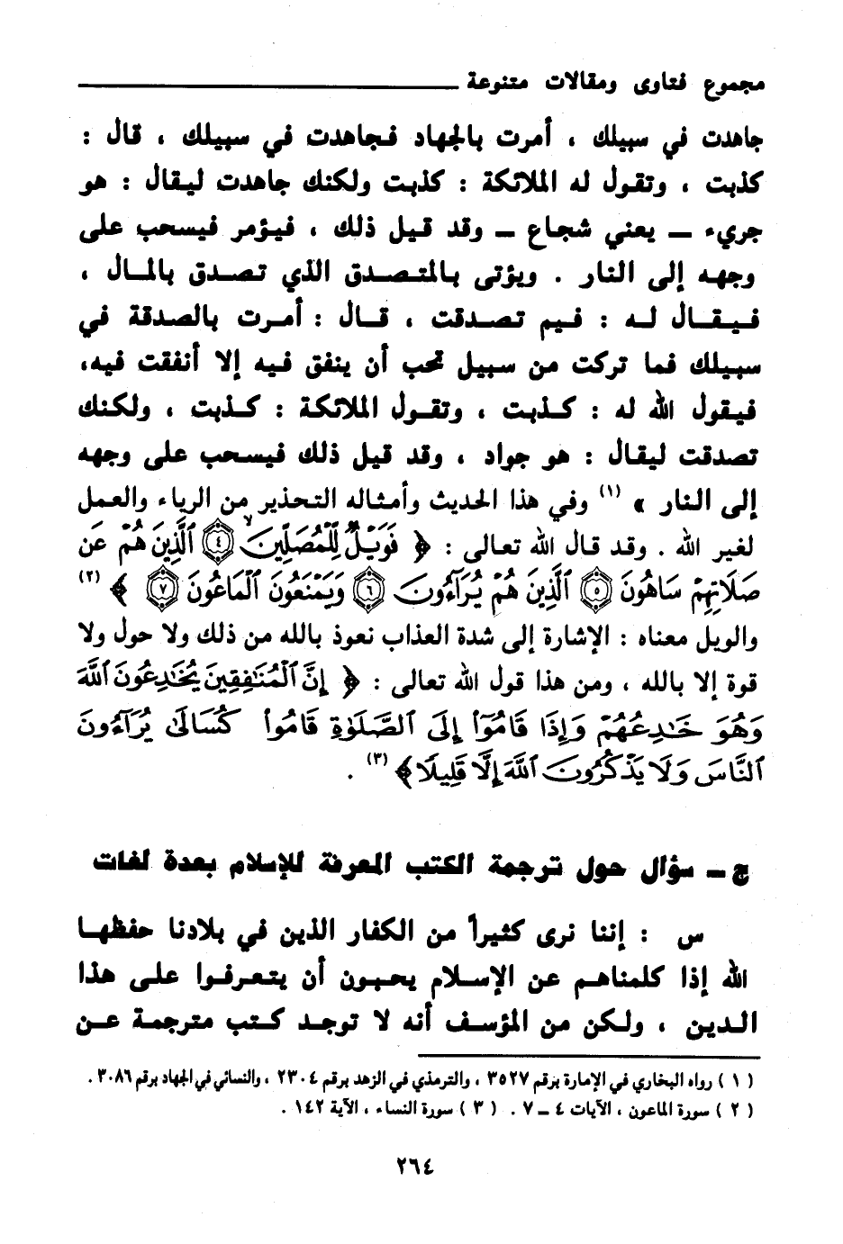 جاهدت في سبيلك، أمرت بالجهاد فجاهدت في سبيلك، قال: كذبت، وتقول له الملائكة: كذبت، ولكنك جاهدت ليقال: هو جريء - يعني شجاع - وقد قيل ذلك، فيؤمر فيسحب على وجهه إلى النار. ويؤتى بالمتصدق الذي تصدق بالمال فيقال له: فيم تصدقت؟ قال: أمرت بالصدقة في سبيلك فما تركت من سبيل تحب أن ينفق فيه إلا أنفقت فيه، فيقول الله له: كذبت، وتقول الملائكة: كذبت، ولكنك تصدقت ليقال: هو جواد وقد قيل ذلك فيسحب على وجهه إلى النار (¬1) » وفي هذا الحديث وأمثاله التحذير من الرياء والعمل لغير الله. وقد قال الله تعالى: {فَوَيْلٌ لِلْمُصَلِّينَ} (¬2) {الَّذِينَ هُمْ عَنْ صَلَاتِهِمْ سَاهُونَ} (¬3) {الَّذِينَ هُمْ يُرَاءُونَ} (¬4) {وَيَمْنَعُونَ الْمَاعُونَ} (¬5) والويل معناه: الإشارة إلى شدة العذاب نعوذ بالله من ذلك ولا حول ولا قوة إلا بالله، ومن هذا قول الله تعالى: {إِنَّ الْمُنَافِقِينَ يُخَادِعُونَ اللَّهَ وَهُوَ خَادِعُهُمْ وَإِذَا قَامُوا إِلَى الصَّلَاةِ قَامُوا كُسَالَى يُرَاءُونَ النَّاسَ وَلَا يَذْكُرُونَ اللَّهَ إِلَّا قَلِيلًا} (¬6)
