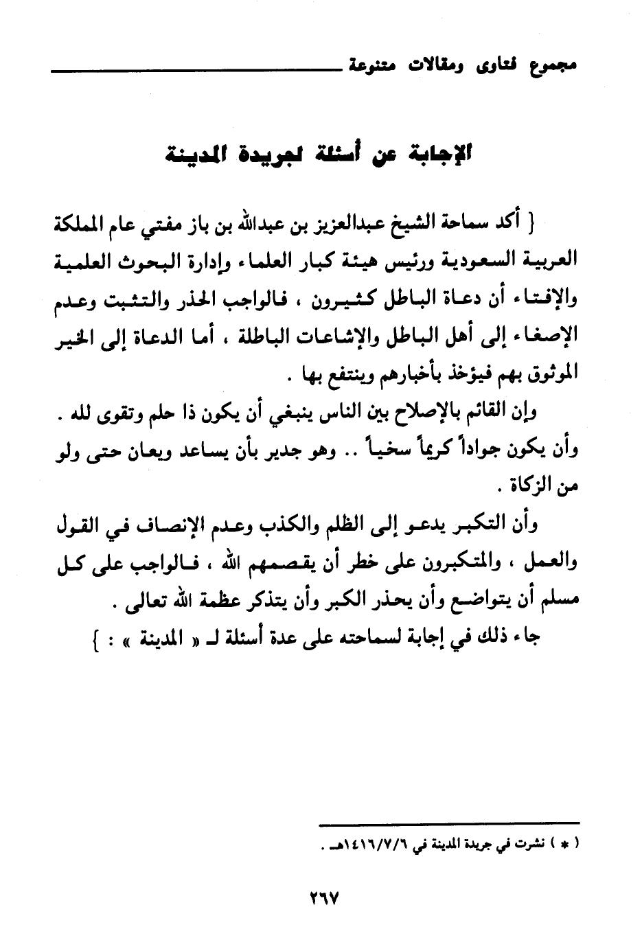 {أكد سماحة الشيخ عبد العزيز بن عبد الله بن باز مفتي عام المملكة العربية السعودية ورئيس هيئة كبار العلماء وإدارة البحوث العلمية والإفتاء أن دعاة الباطل كثيرون، فالواجب الحذر والتثبت وعدم الإصغاء إلى أهل الباطل والإشاعات الباطلة، أما الدعاة إلى الخير الموثوق بهم فيؤخذ بأخبارهم وينتفع بها.