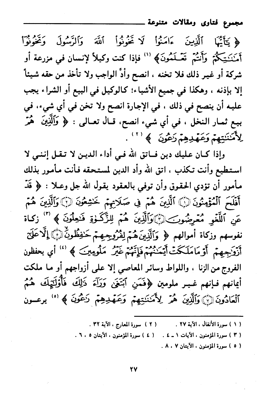 {يَا أَيُّهَا الَّذِينَ آمَنُوا لَا تَخُونُوا اللَّهَ وَالرَّسُولَ وَتَخُونُوا أَمَانَاتِكُمْ وَأَنْتُمْ تَعْلَمُونَ} (¬1) فإذا كنت وكيلا لإنسان في مزرعة أو شركة أو غير ذلك فلا تخنه، انصح وأد الواجب ولا تأخذ من حقه شيئا إلا بإذنه، وهكذا في جميع الأشياء كالوكيل في البيع أو الشراء يجب عليه أن ينصح في ذلك، في الإجارة انصح ولا تخن في أي شيء، في بيع ثمار النخل، في أي شيء انصح. قال تعالى: {وَالَّذِينَ هُمْ لِأَمَانَاتِهِمْ وَعَهْدِهِمْ رَاعُونَ} (¬2)