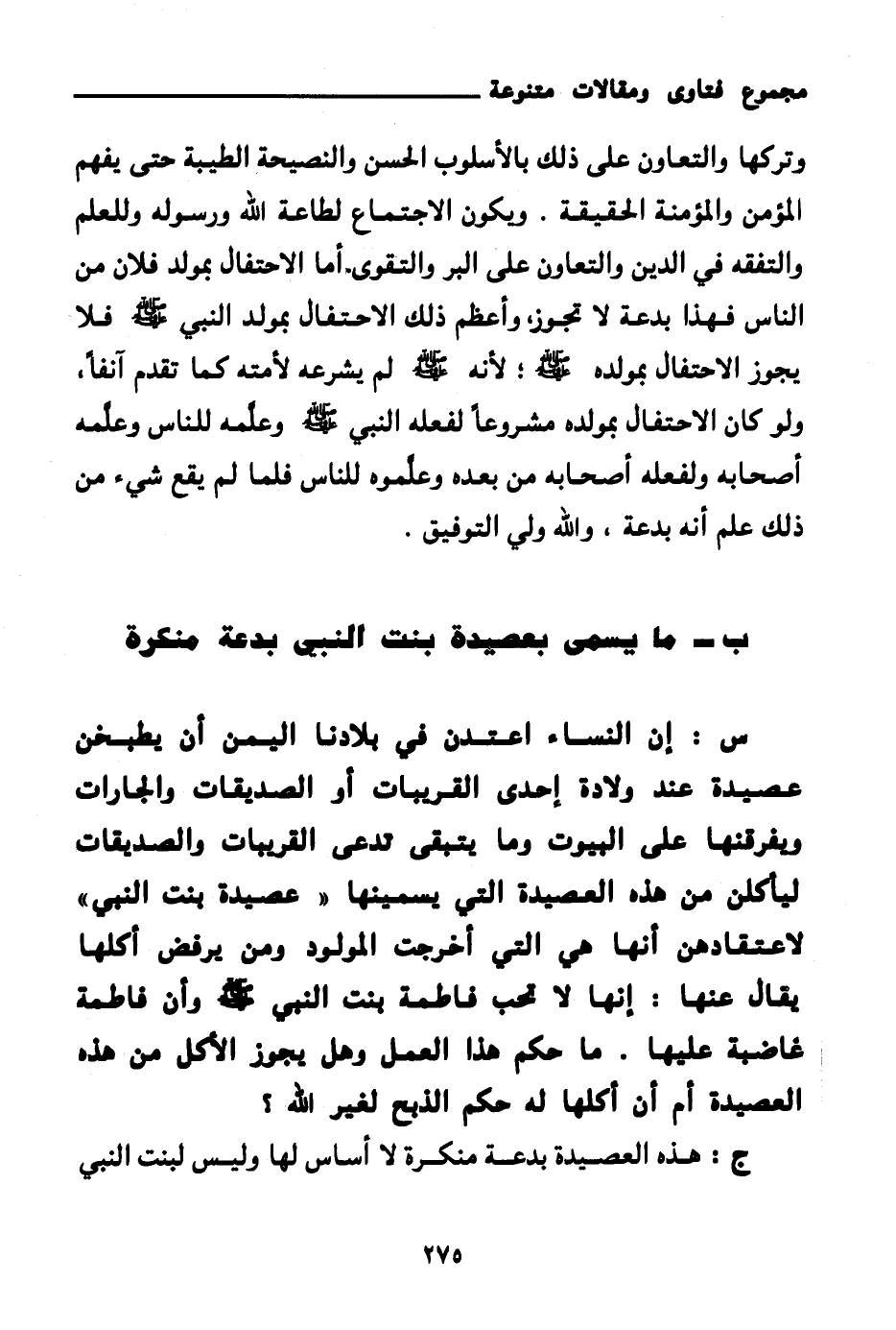 س: إن النساء اعتدن في بلادنا اليمن أن يطبخن عصيدة عند ولادة إحدى القريبات أو الصديقات والجارات ويفرقنها على البيوت وما يتبقى تدعى القريبات والصديقات ليأكلن من هذه العصيدة التي يسمينها " عصيدة بنت النبي " لاعتقادهن أنها هي التي أخرجت المولود ومن يرفض أكلها يقال عنها: إنها لا تحب فاطمة بنت النبي صلى الله عليه وسلم وأن فاطمة غاضبة عليها. ما حكم هذا العمل وهل يجوز الأكل من هذه العصيدة أم أن أكلها له حكم الذبح لغير الله؟