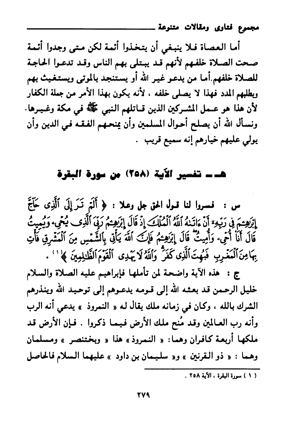 ج: هذه الآية واضحة لمن تأملها فإبراهيم عليه الصلاة والسلام خليل الرحمن قد بعثه الله إلى قومه يدعوهم إلى توحيد الله وينذرهم الشرك بالله، وكان في زمانه ملك يقال له: " النمروذ " يدعي أنه الرب وأنه رب العالمين وقد منح ملك الأرض فيما ذكروا. فإن الأرض قد ملكها أربعة: كافران: وهما: " النمروذ " هذا " وبختنصر ". ومسلمان وهما: " ذو القرنين " و " سليمان بن داود " عليهما السلام فالحاصل